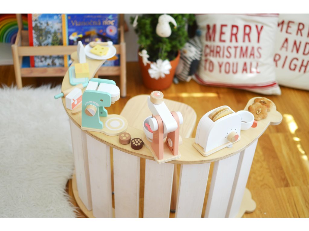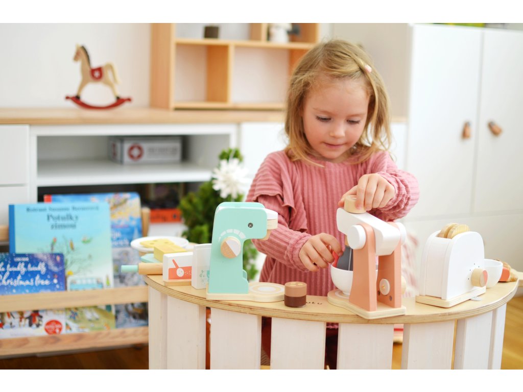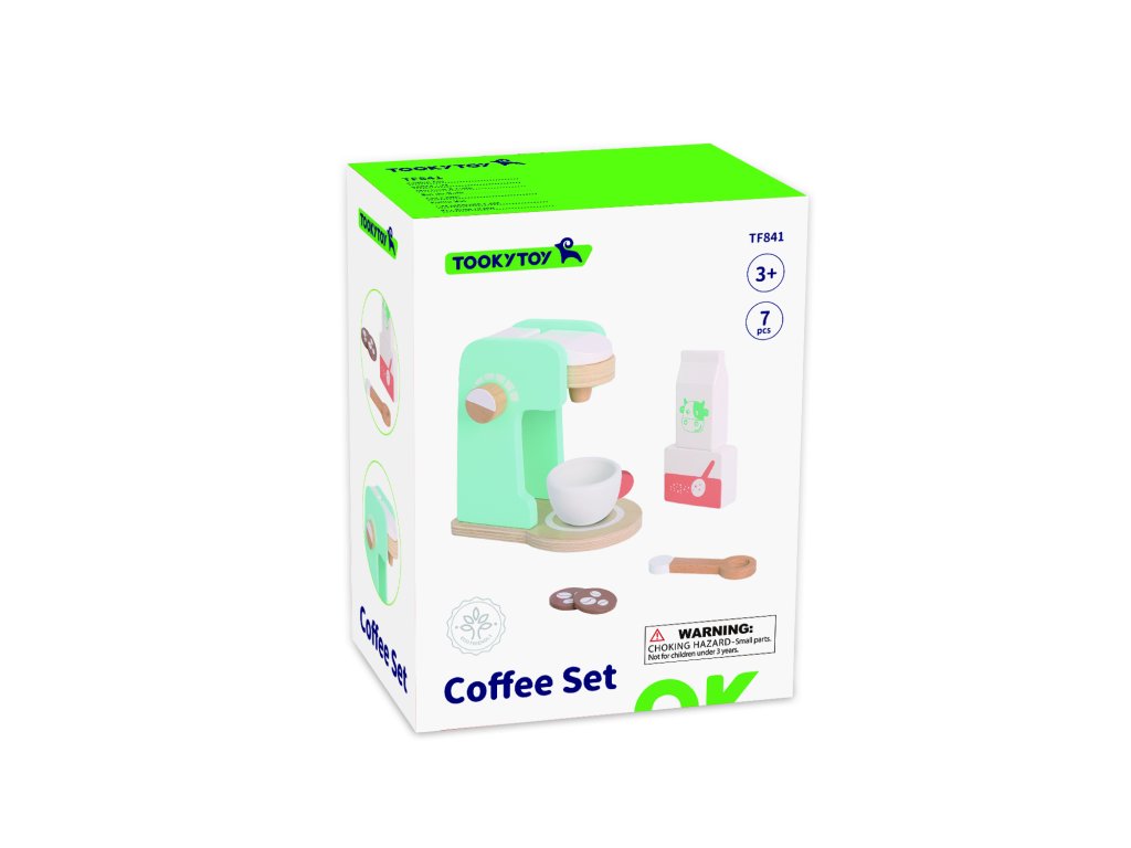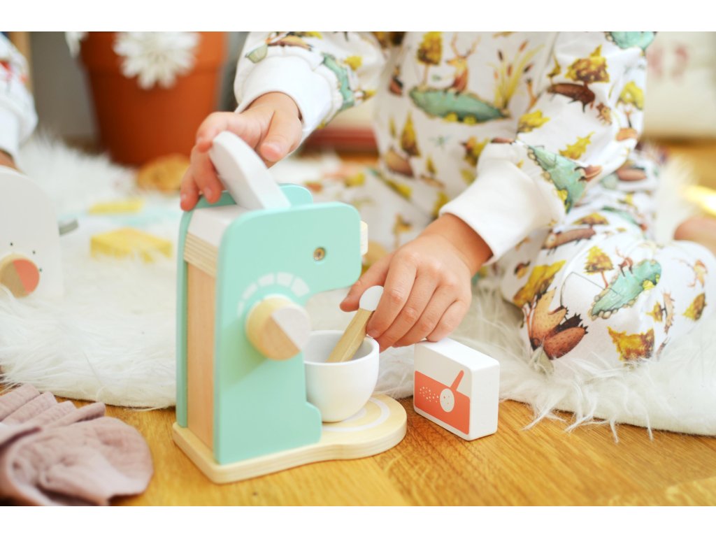 Kávovar s príslušenstvom Nechajte si uvariť skvelú kávičku! Krásna drevená sada je skvelým doplnkom do každej detskej kuchynky. Súčasťou kávovaru je biela šálka, kávové zrnká, mlieko a lyžička na zamiešanie. Deti si rozvíjajú sociálne zručnosti. Kávovar je jako stvorený pre rolové hry. Sadu si môžete rozšíriť aj o ďalšie doplnky ako Hriankovač s príslušenstvom z tejto rady. Spotrebiče podporujú rozvoj motorických schopností a sociálnych zručností.Dodatočné parametre