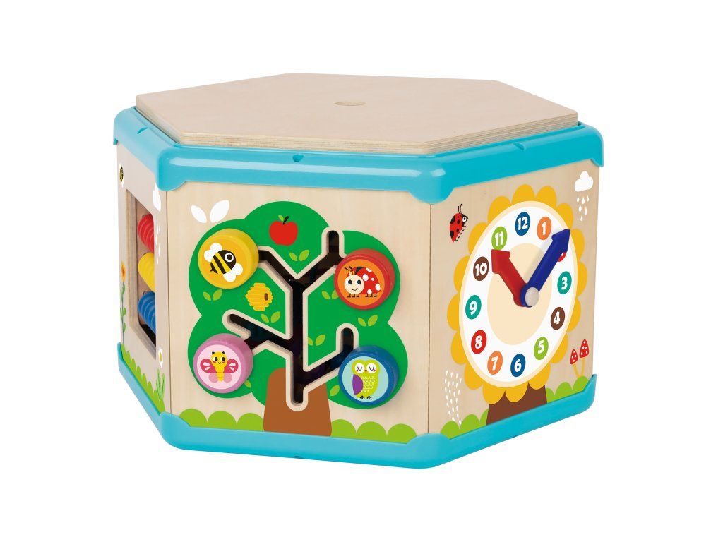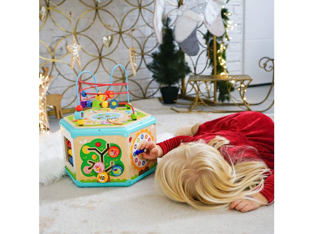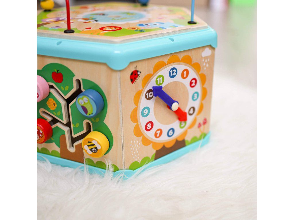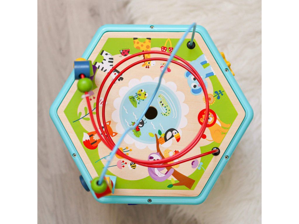 Kocka s aktivitami 7v1 Drevený multifunkčný šesťuholník so 7 aktivitami Interaktívna vzdelávacia hračka ponúka iný typ aktivity na každej strane. Deti môžu posúvať korálky bludiskom, otáčať ozubenými kolieskami, vkladať tvary alebo sa učiť hodiny. Nádherné prevedenie celého pultíka motivuje deti k hre.Deti sa učia a trénujú si jemnú motoriku Hranie rozvíja u detí schopnosť logického myslenia, cvičí si kooperatívne a praktické zručnosti. Kocka podporuje koordináciu ruka-oko. Vrchnú časť kocky je možné otvoriť a použiť ju ako úložný priestor.Dodatočné parametre