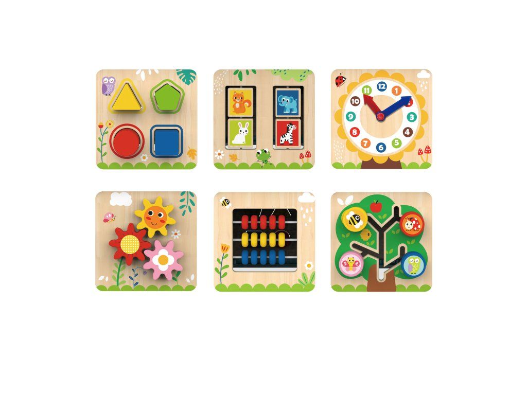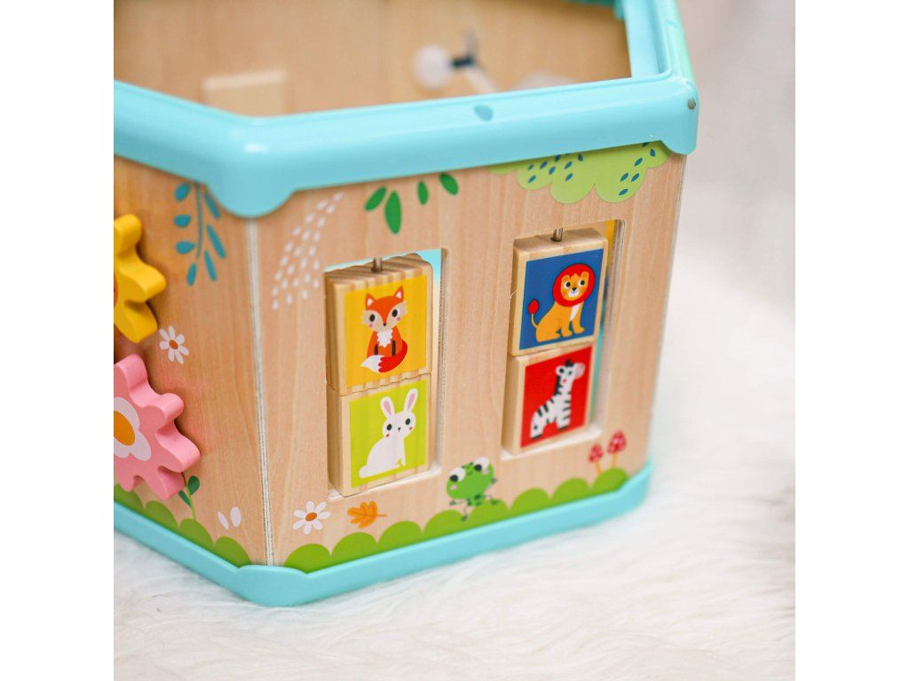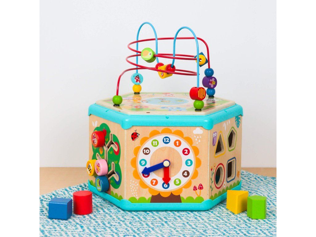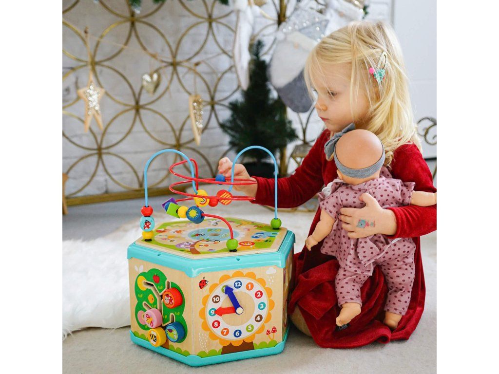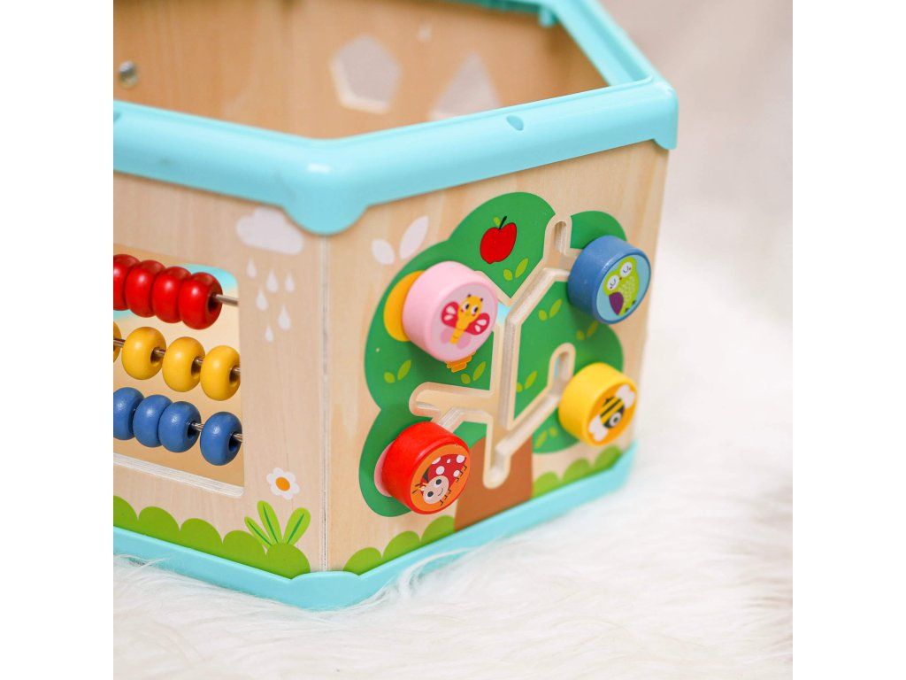 Kocka s aktivitami 7v1 Drevený multifunkčný šesťuholník so 7 aktivitami Interaktívna vzdelávacia hračka ponúka iný typ aktivity na každej strane. Deti môžu posúvať korálky bludiskom, otáčať ozubenými kolieskami, vkladať tvary alebo sa učiť hodiny. Nádherné prevedenie celého pultíka motivuje deti k hre.Deti sa učia a trénujú si jemnú motoriku Hranie rozvíja u detí schopnosť logického myslenia, cvičí si kooperatívne a praktické zručnosti. Kocka podporuje koordináciu ruka-oko. Vrchnú časť kocky je možné otvoriť a použiť ju ako úložný priestor.Dodatočné parametre