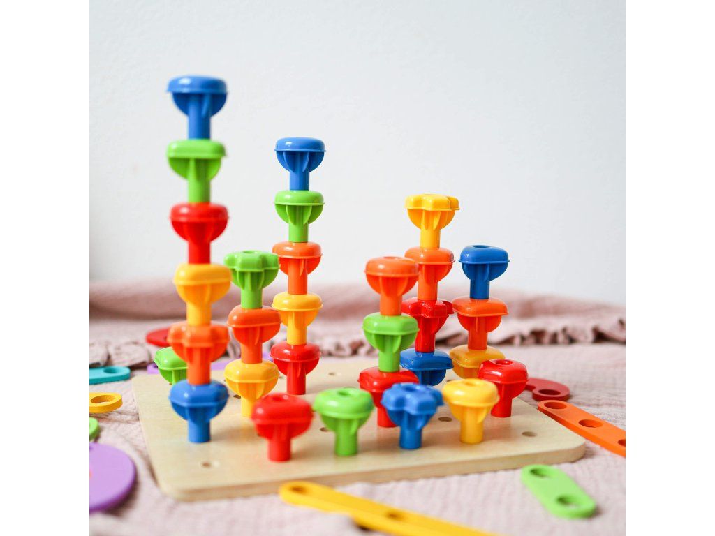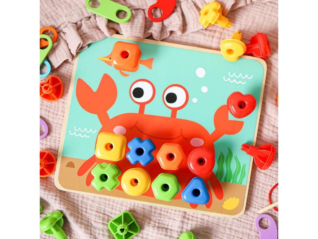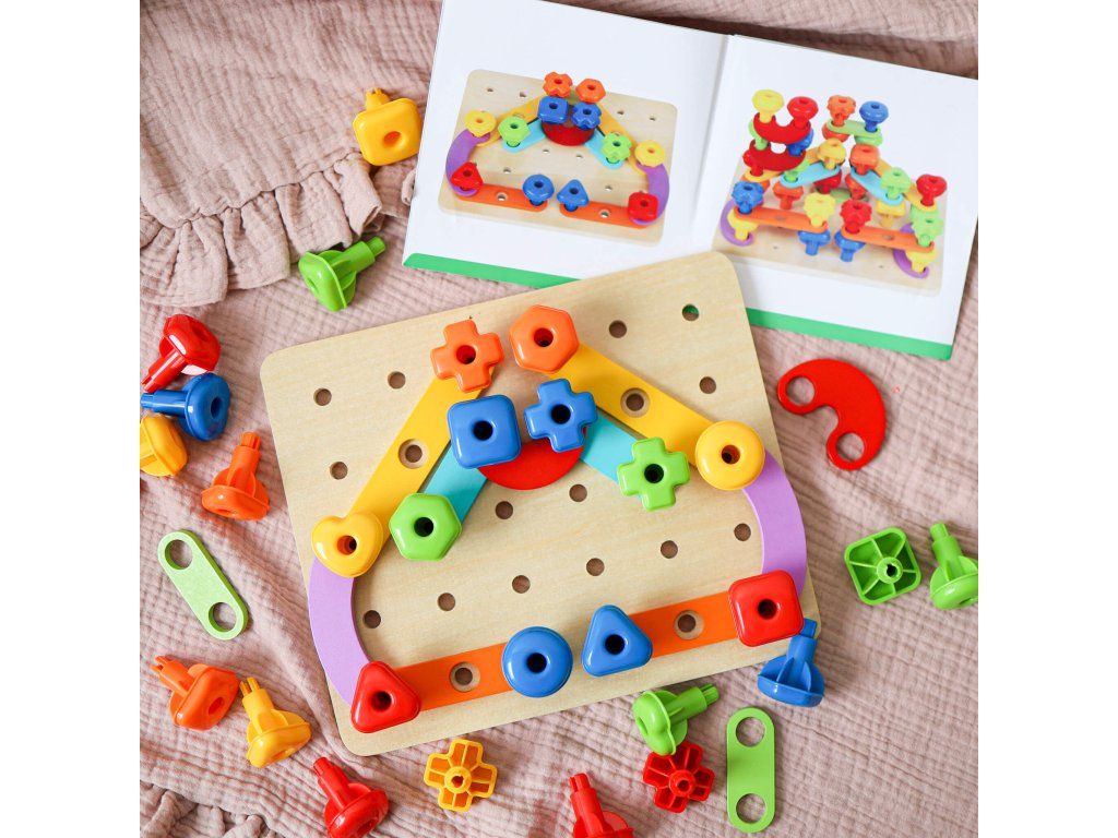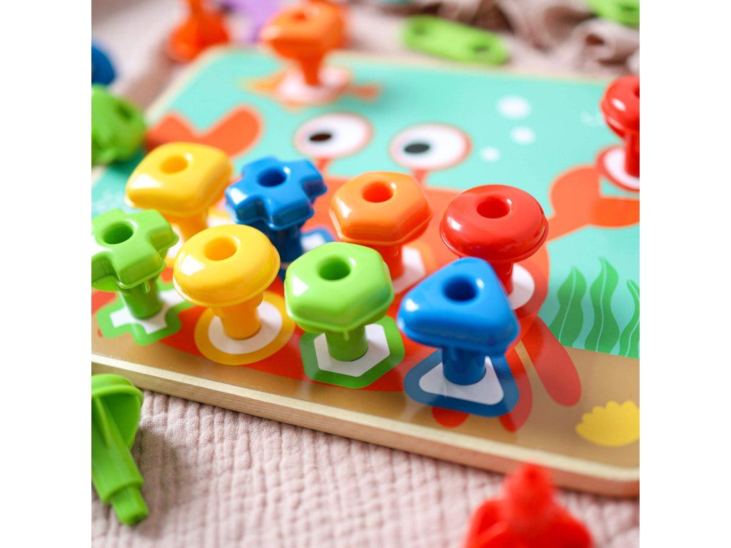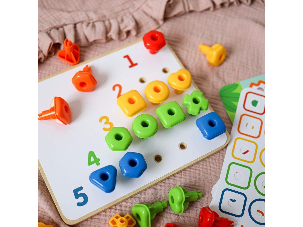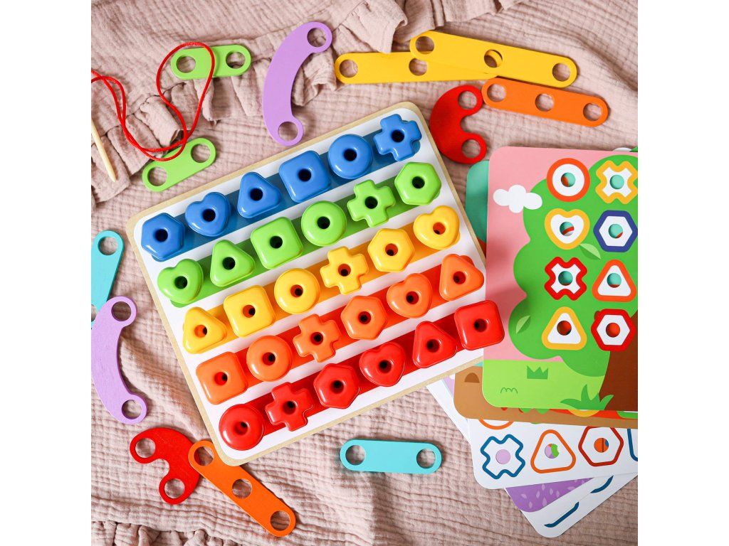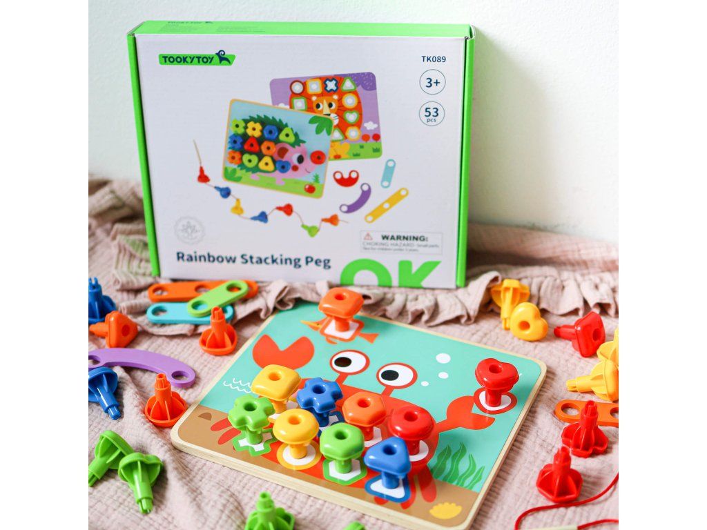 Logická stavebnica DúhaZábavný spôsob, ako sa učiť triediť, spájať a tvoriťObjavte s dieťaťom nádherne farebnú hru od značky Tooky Toy s názvom Logická stavebnica “Dúha” — hra plná skladania, navliekania a kreatívneho premýšľania. Čo ju robí skutočne zaujímavou?Obsahuje 8 predlôh, ktoré dieťa najprv položí na drevenú dosku s dierkami, potom vloží kolíčky správnej farby a tvaru a následne navlieka ďalšie súčiastky. Navyše je súčasťou sady povrázok s ihlou – slúži na navliekanie kolíčkov.Materiál: kvalitné drevo s povrchovou úpravou. Určené pre deti vo veku 2-5 rokov – vhodné pre chlapcov aj dievčatá. Podporuje schopnosti ako farby, tvary, jemná motorika.ňDodatočné parametre
