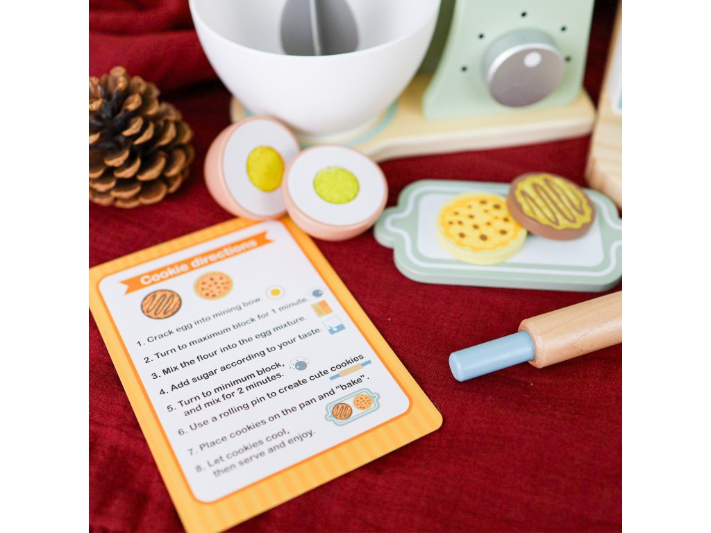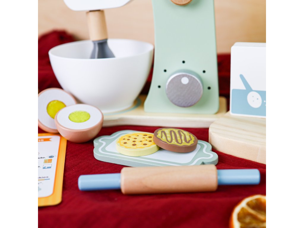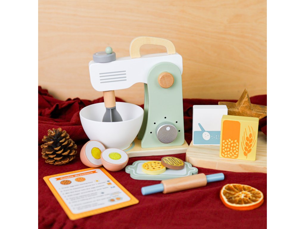 Mixér s príslušenstvom Pastel Upeč svoje vlastné sušienky! Neprehliadnuteľný detský drevený mixér v pastelových farbách od Tooky Toy je skvelou hračkou na rolové hry na dospelých aj profesie. Drevený mixér sa stane jedinečným doplnkom detskej kuchynky, ale dá sa využiť pri hre na kuchára či cukrára. Celkom sa skladá z 10 drevených dielikov na pečenie a servírovanie sušienok. Okrem mixéra nechýbajú ingrediencie na pečenie, ale aj podnos či hotové sušienky. Mixér má niekoľko mechanických prvkov, aby hra deti ešte viac bavila.Deti si rozvíjajú sociálne zručnosti Detský drevený mixér v pastelových farbách s príslušenstvom, pomáha deťom vďaka hre na dospelých zlepšovať sa v sociálnych zručnostiach a komunikácii. Deti sú pri hre kreatívne a získavajú kladný vzťah k príprave a servírovaniu jedla. Drevené hračky pre deti Tooky Toy sú vyrobené z pevného, dobre opracovaného dreva z udržateľných zdrojov a sú natreté netoxickými farbami a lakom. Sada je skvelým narodeninovým darčekom pre deti.Dodatočné parametre