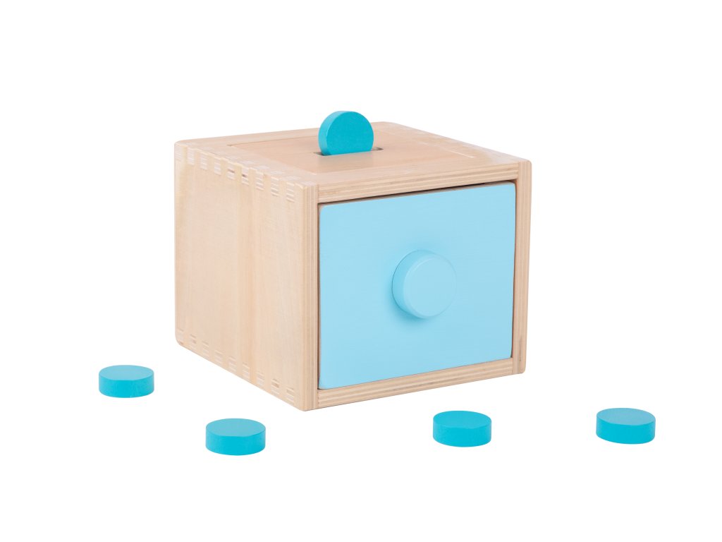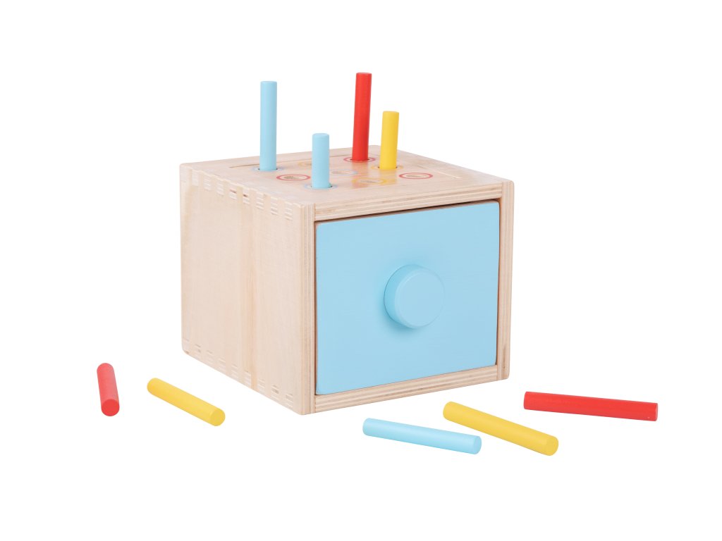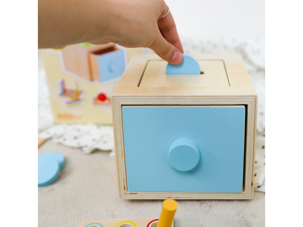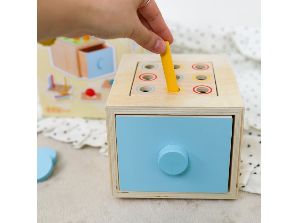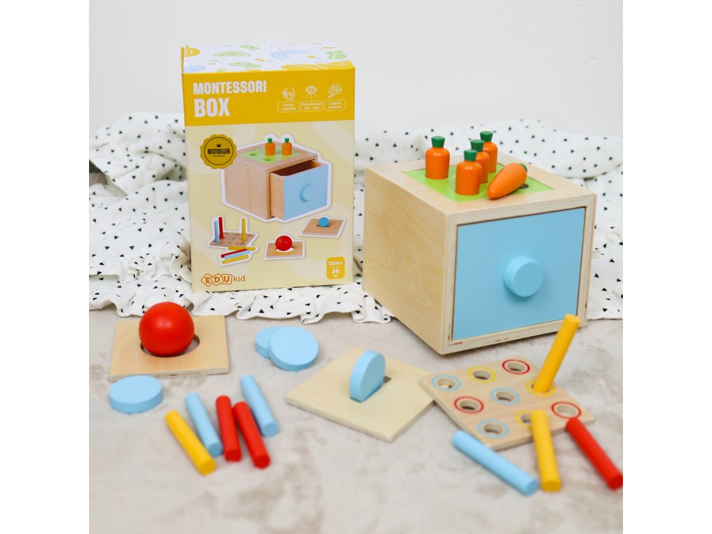 Montessori box 4v1 Najlepšia multifunkčná hračka pre rozvoj detí Montessori hračky sú známe svojím prístupom k podpore prirodzeného rozvoja dieťaťa prostredníctvom učenia hrou. Montessori box je originálna multifunkčná hračka, ktorá ponúka štyri rôzne spôsoby využitia podľa aktuálneho rozvojového štádia dieťatka. Drevený box so zásuvkou má vymeniteľný vrch, čo umožňuje deťom meniť aktuálnu hru. Aké typy vkladačiek v montessori boxe nájdete?1) vhadzovanie guličky - vhodné pre deti od 12 mesiacov2) vhadzovanie mince - vhodné pre deti od 12 mesiacov3) vhadzovanie mrkvičiek - vhodné pre deti od 15 mesiacov4) vhadzovanie farebných paličiek - vhodné pre deti od 24 mesiacov - najprv sa dieťa učí trafiť paličku do akejkoľvek z dierok. Neskoršie môžete hru spraviť náročnejšou a dieťa sa musí trafiť do diery v rovnakej farbe ako je paličkaVšestranná montessori hračka rastie spolu s dieťaťom Montessori box podporuje rozvoj detí vo viacerých oblastiach. Pri hre si deti zlepšujú svoju jemnú motoriku, koordináciu ruka-oko a učia sa rozpoznávať farby a tvary, čím rozvíjajú aj svoje logické myslenie. Učenie hrou im poskytuje príležitosť zažiť úspech pri každom správne vloženom predmete, čo podporuje ich sebavedomie. Táto vkladačka 4v1 tiež umožňuje deťom rozvíjať zručnosti triedenia a rozpoznávania tvarov, čo sú dôležité kroky v ich intelektuálnom rozvoji.Dodatočné parametre