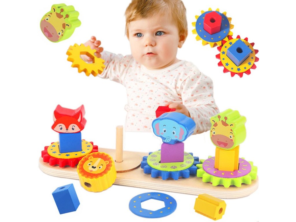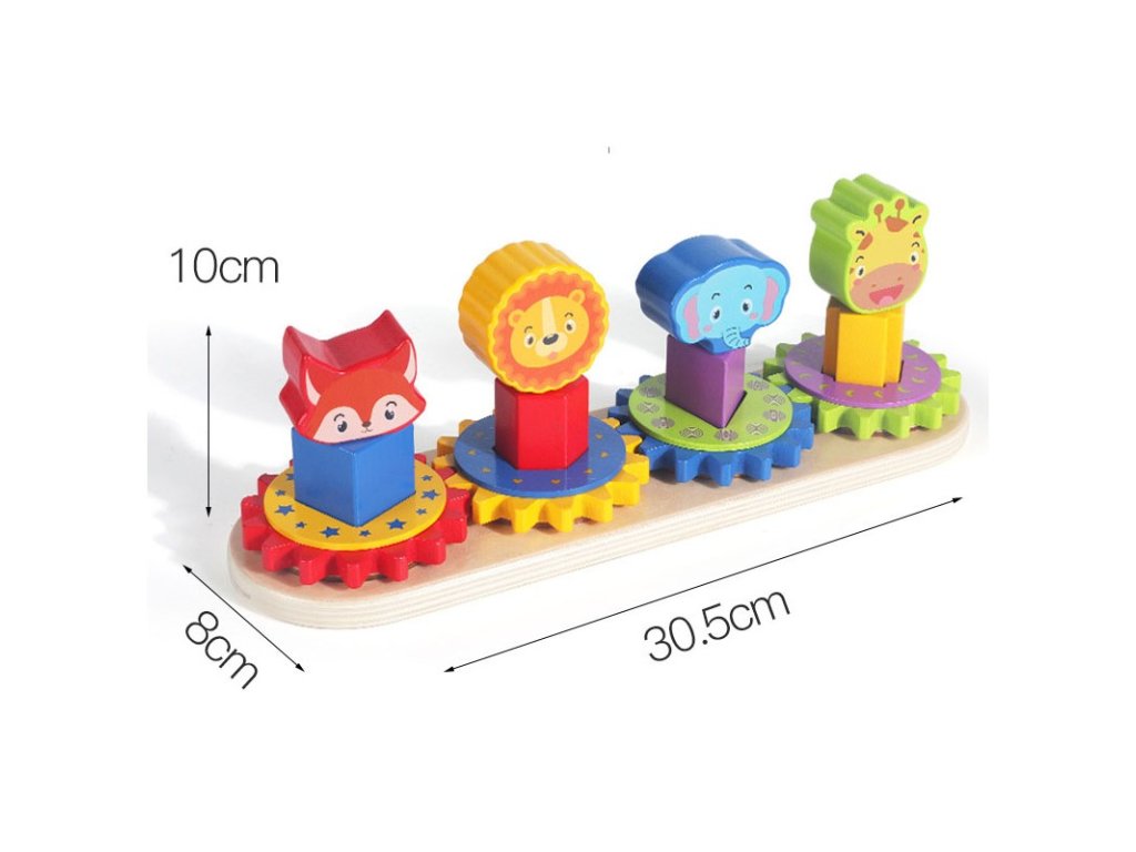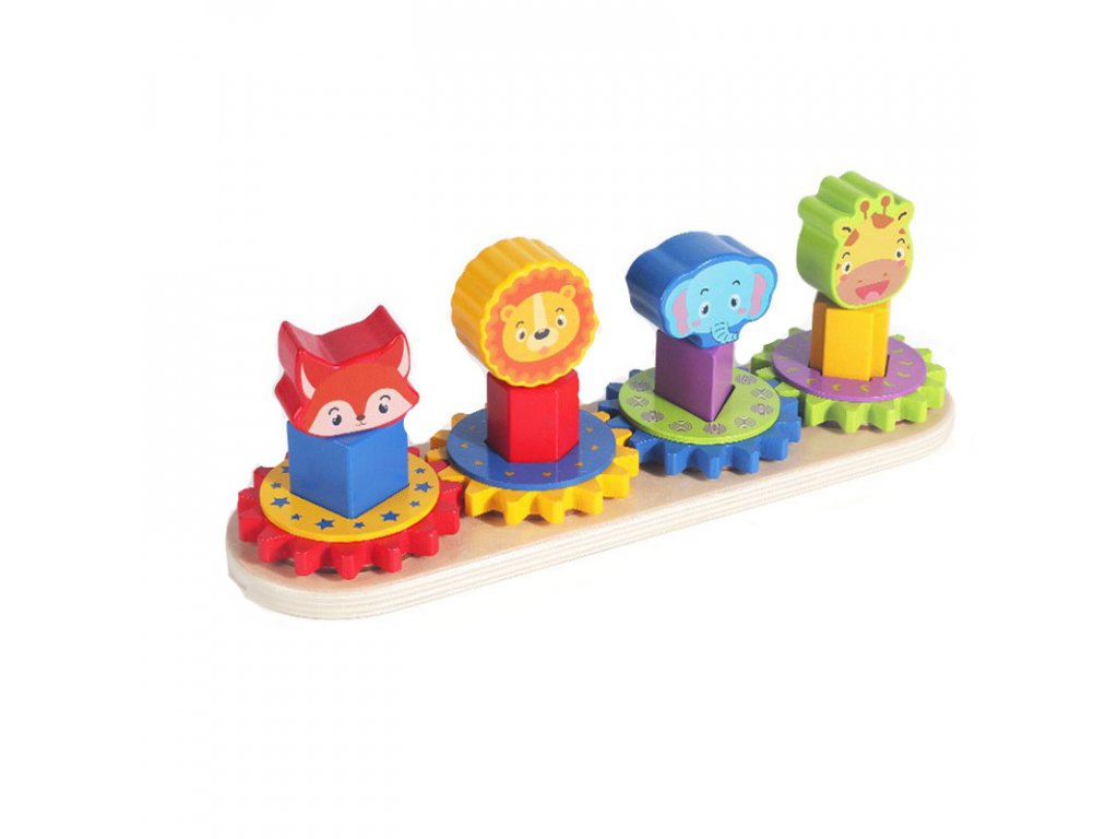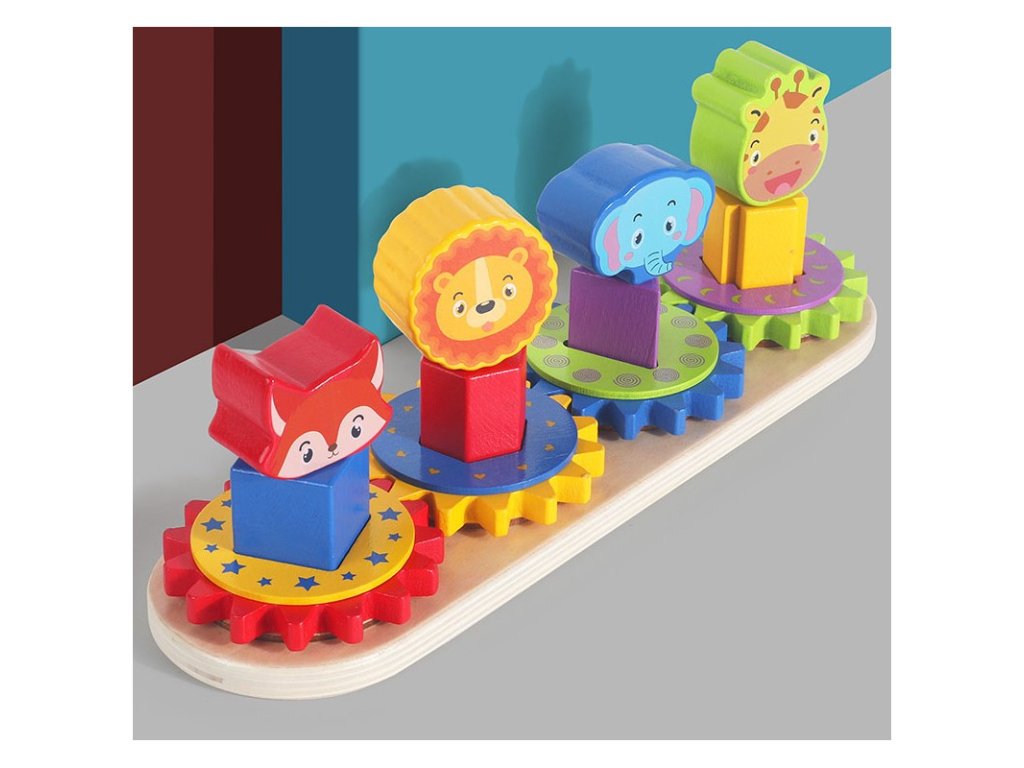Montessori hra skladačka s ozubenými kolesami rozvíja koordináciu rúk, očí, jemnú motoriku a trpezlivosť. Vďaka hre sa dieťa naučí poznávať tvary a farby, každé ozubené koleso má totiž inú farbu a tvar zvieratka.
