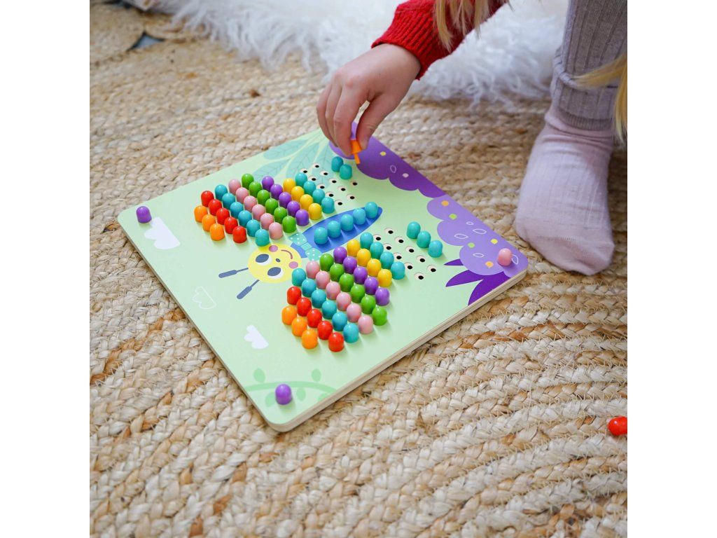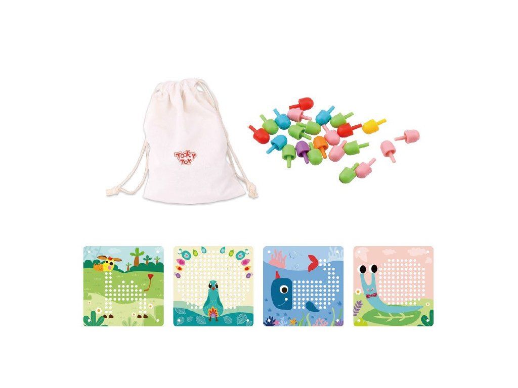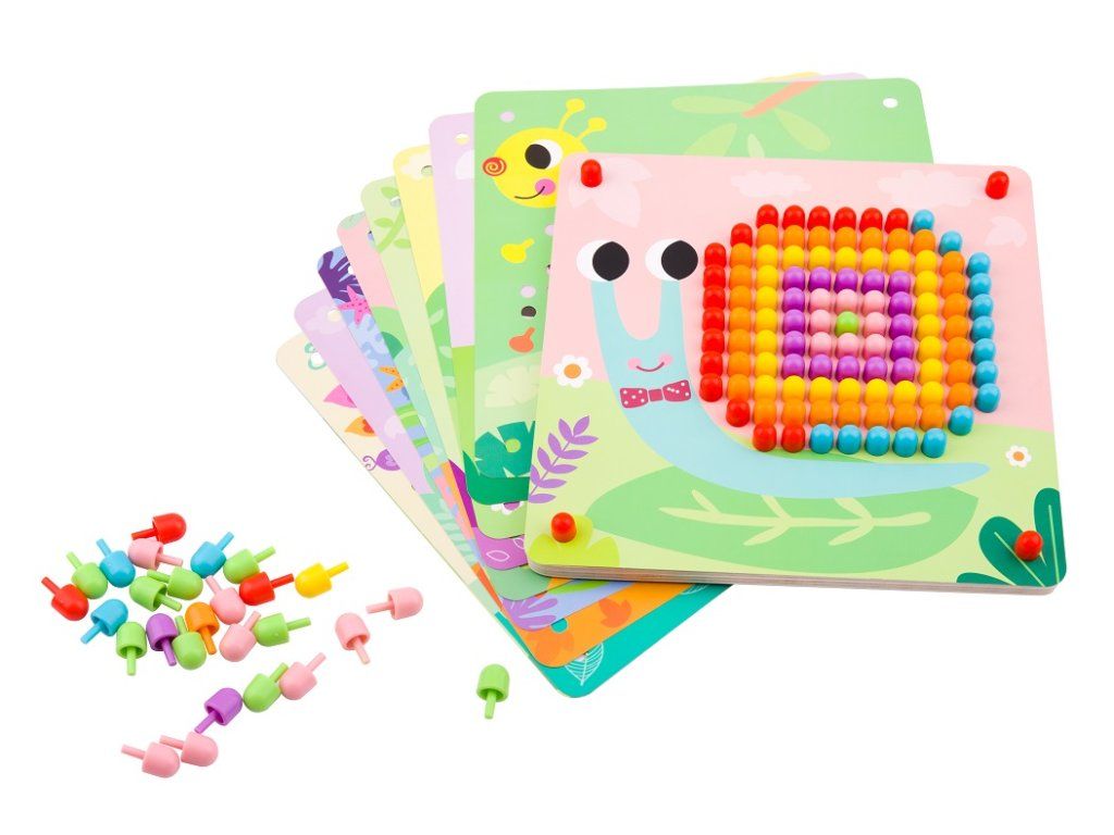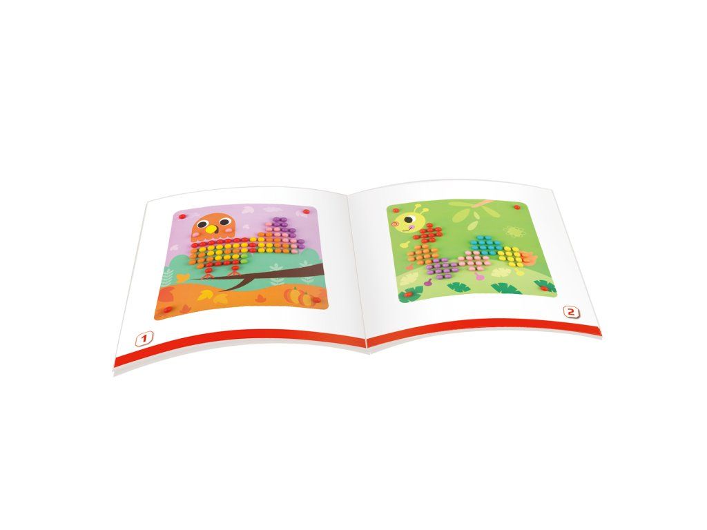 Prvá spoločenská hra - malá mozaika Malá mozaika s obrázkami zvieratiek rozvíja detskú kreativitu. Vkladaj malé farebné hríbiky do dierok na doske a dotvor si zvieratko podľa ľubovôle. Dieťatku pomáhajú pri tvorbe mozaiky jednotlivé predlohy, ale môžu tiež popustiť uzdu svojej fantázii.Detičky si zlepšujú jemnú motoriku. Vďaka práci s malými hríbikmi si detské ruky cibria svoj úchop. Hríbiky ale tiež môžu počítať alebo si ich triediť podľa farieb. V balení nájdete umelohmotné farebné hríbiky a 10 mozaikových predlôh zvieratiek. Deti od 3 rokov tak majú dostatok priestoru na svoj rozvoj.Dodatočné parametre