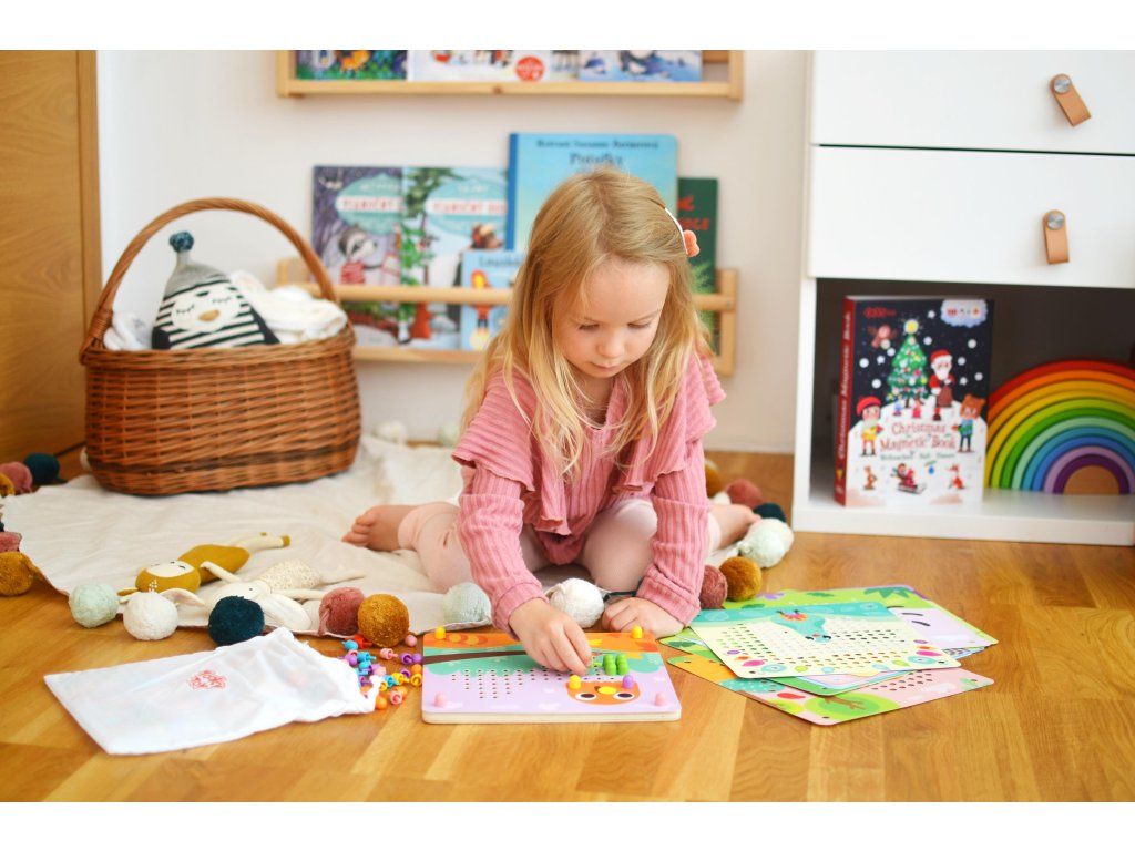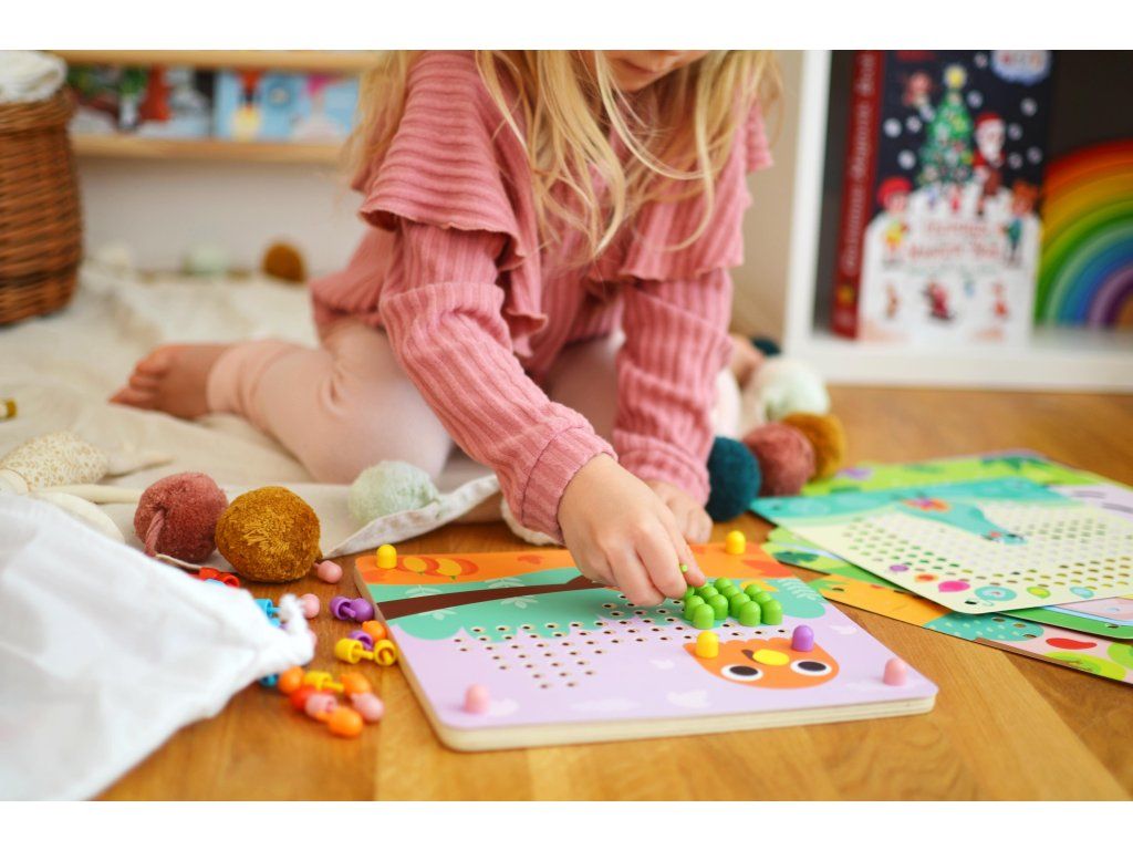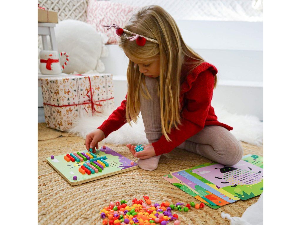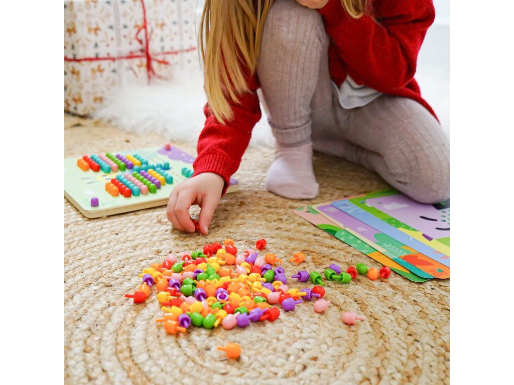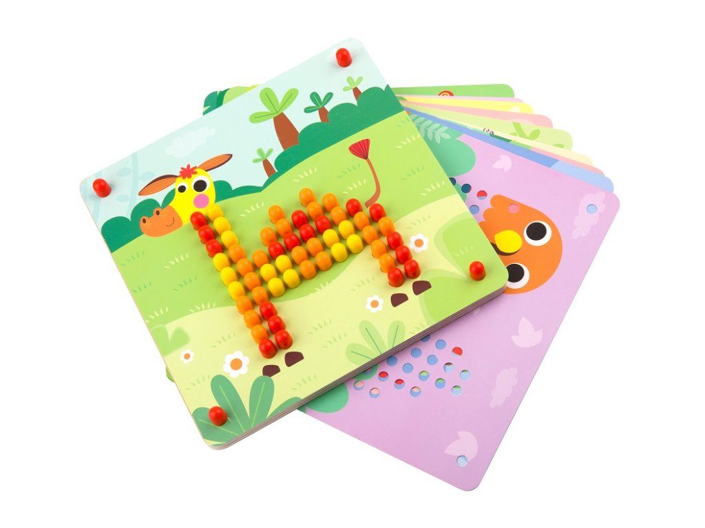 Prvá spoločenská hra - malá mozaika Malá mozaika s obrázkami zvieratiek rozvíja detskú kreativitu. Vkladaj malé farebné hríbiky do dierok na doske a dotvor si zvieratko podľa ľubovôle. Dieťatku pomáhajú pri tvorbe mozaiky jednotlivé predlohy, ale môžu tiež popustiť uzdu svojej fantázii.Detičky si zlepšujú jemnú motoriku. Vďaka práci s malými hríbikmi si detské ruky cibria svoj úchop. Hríbiky ale tiež môžu počítať alebo si ich triediť podľa farieb. V balení nájdete umelohmotné farebné hríbiky a 10 mozaikových predlôh zvieratiek. Deti od 3 rokov tak majú dostatok priestoru na svoj rozvoj.Dodatočné parametre