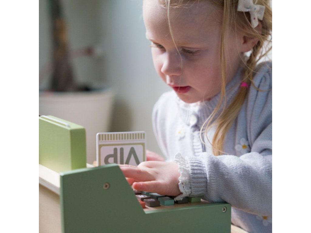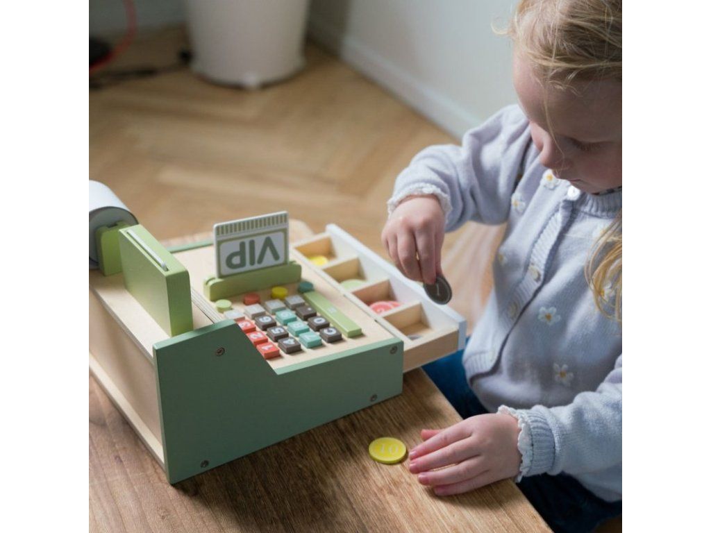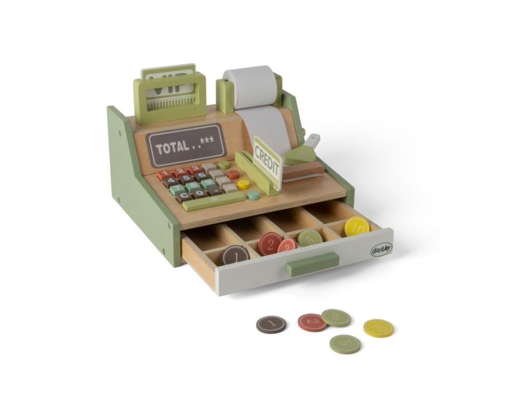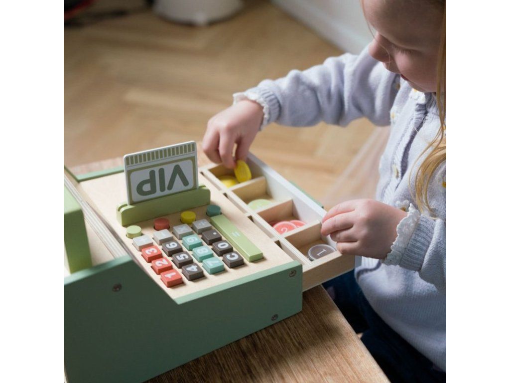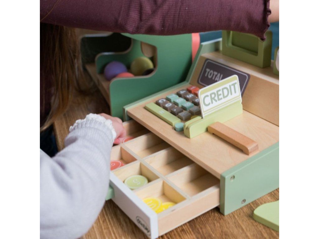 - drevená pokladňa, ideálna pre rolu predavača a zákazníka
