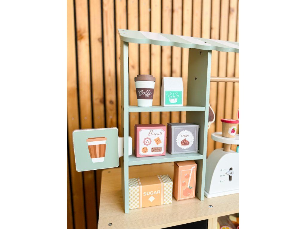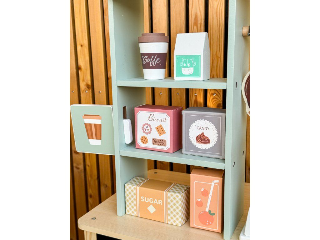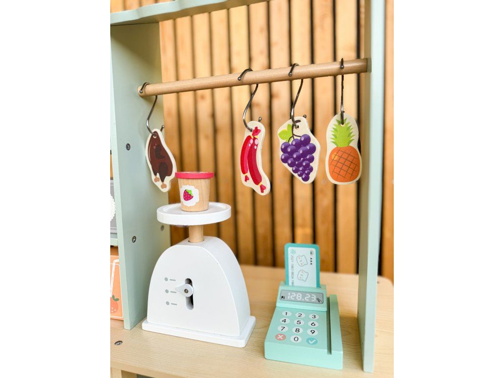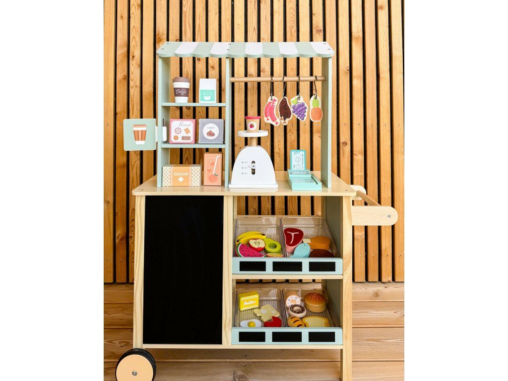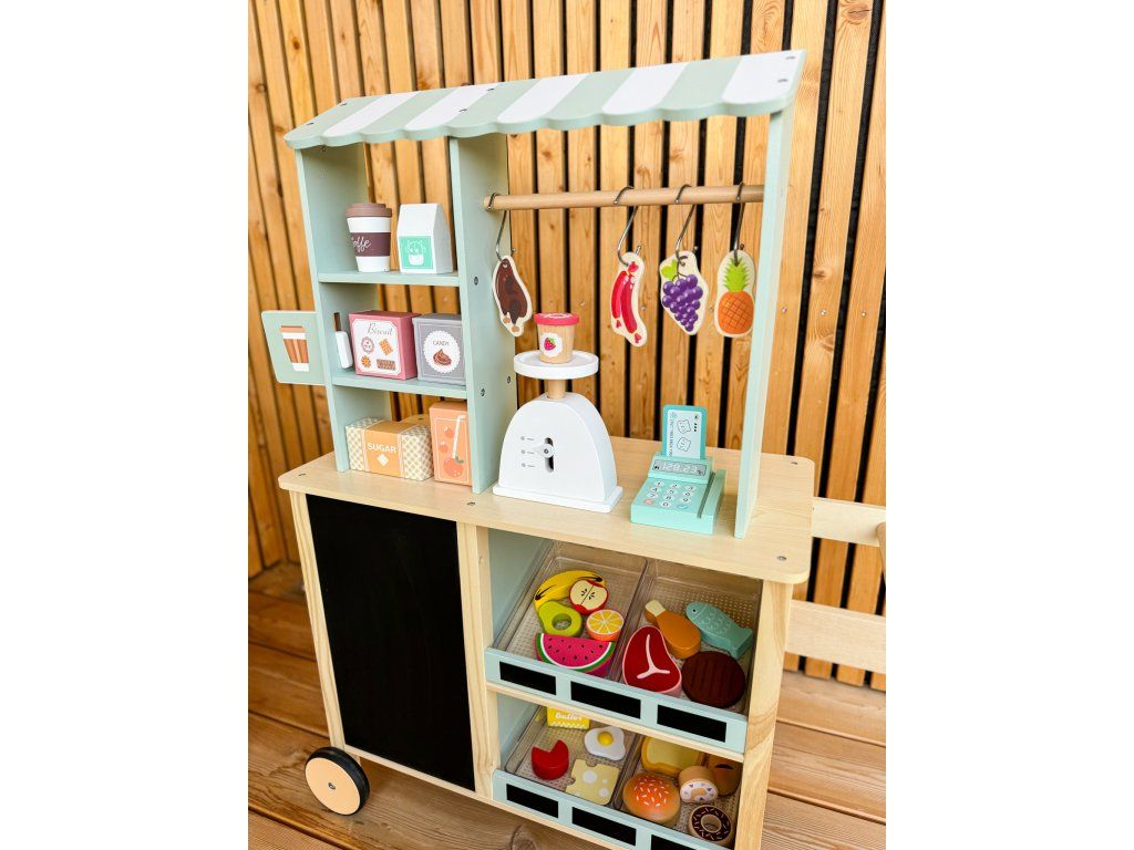 a nablokovať na pokladni. Detský drevený predajný stánok, ktorý je plný