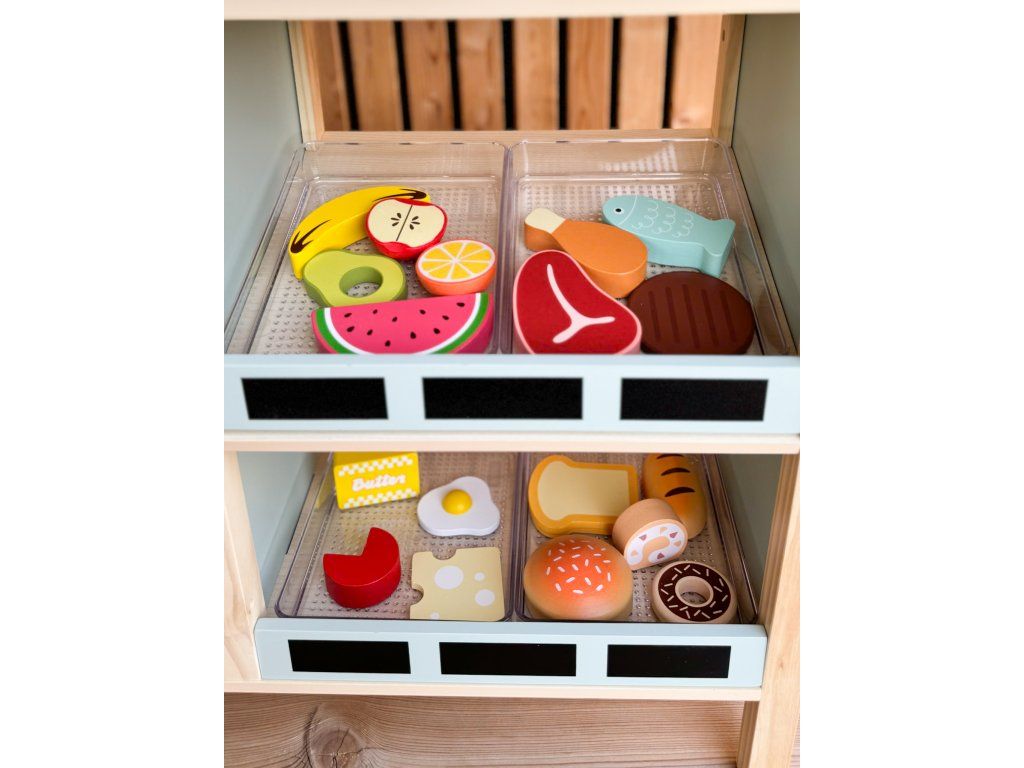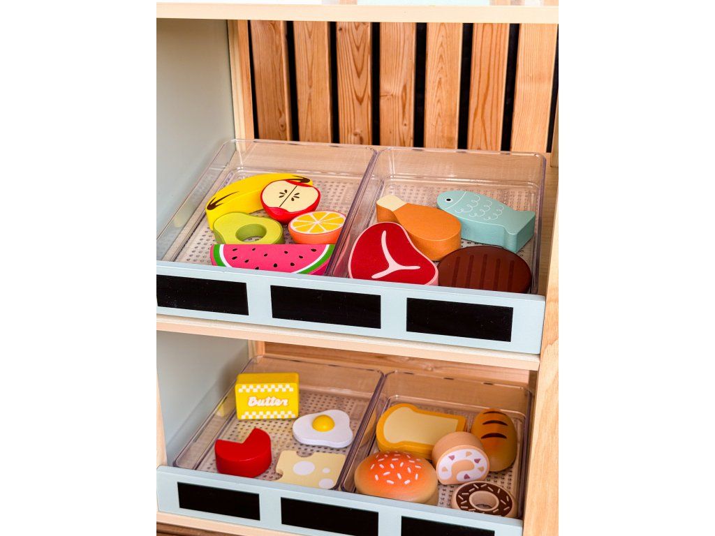 dreva a netoxických farieb. Drevené príslušenstvo stánku zahŕňa ovocie,