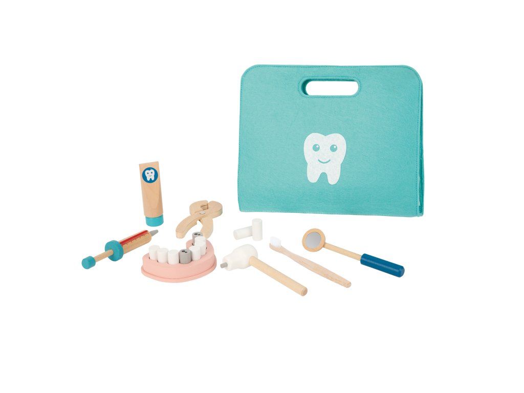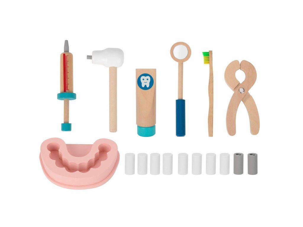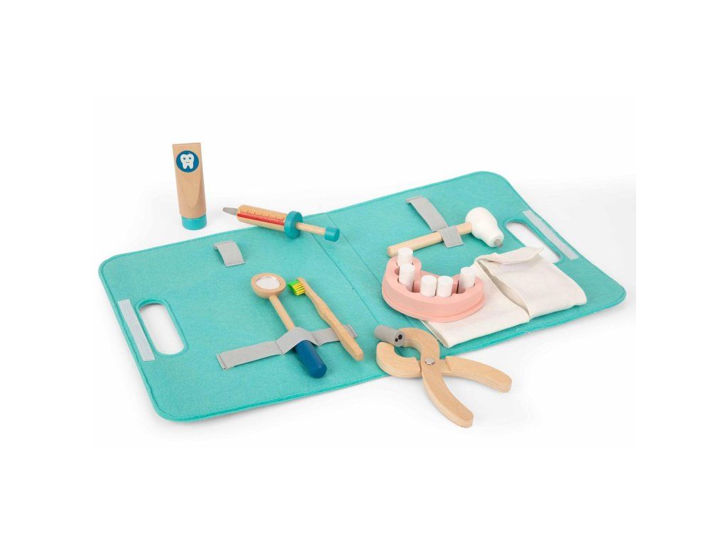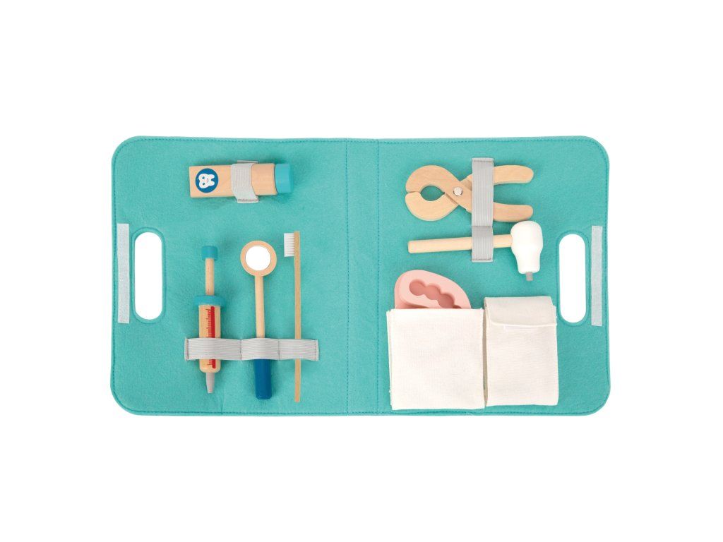 Zubárska sada v taštičke 16 ks Poďme sa hrať na zubára! Drevená zubárska súprava pre deti v textilnej taštičke značky Tooky Toy umožní deťom hrať sa na zubára doma aj na návšteve! Vďaka bohatej drevenej výbave, ako je vŕtačka, kliešte, zrkadlo, kefka ale aj samotné zuby, sa deti budú cítiť ako skutoční profesionáli. Všetko zubárske vybavenie po úspešne zvládnutom zubárskom zákroku zase upratá do jednoduchého látkového puzdra s držiakom. Sada vás poteší aj vďaka svojej skladnosti a menšej veľkosti! Tento detský zubársky kufrík ľahko vezmete aj na cesty.Zubársky kufrík s vybavením podporí rozvoj detí Hra na zubára, rovnako ako ostatné rolové hry, pomáha deťom v rozvoji ich zručností, ako sú sociálne zručnosti, komunikácia, rozprávanie, fantázie a ďalšie. Zubársky kufrík tiež pomáha deťom zbaviť sa strachu z návštevy stomatológa. Hračky pre deti značky Tooky Toy sú vyrobené z kvalitných materiálov s ohľadom na životné prostredie. Celý set je tak veľmi bezpečný a netoxický.Dodatočné parametre