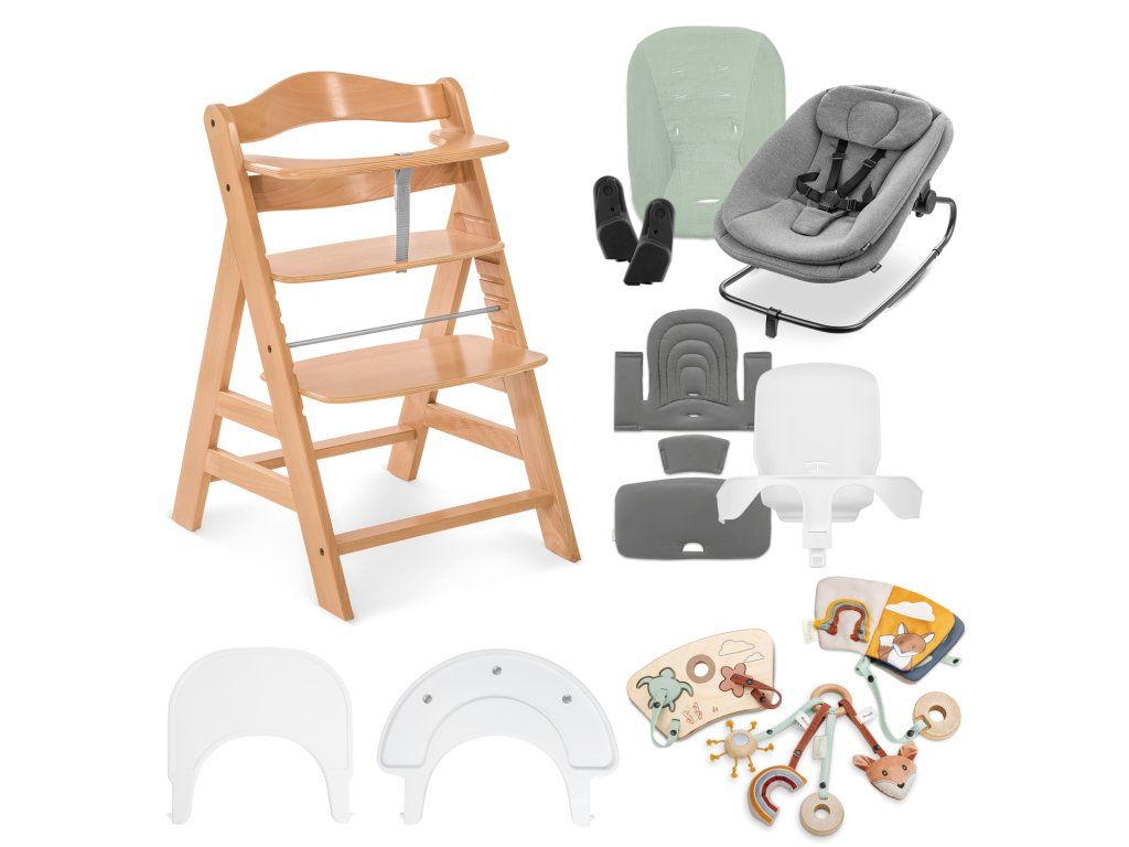 KOMPLETNÁ SADA PRE BEZSTAROSTNÝ ZAČIATOK // Nech máte bábätko, batoľa alebo dospelého člena rodiny, sada Alpha+ Start N Grow bude vašej rodine slúžiť mnoho rokov vďaka vysokej drevenej stoličke, kresielku 3 v 1, náhradnému ochrannému poťahu na kresielko, redukčnému sedátku a polstrovaniu, tácke a hracímu tácke s tromi senzorickými hračkami.