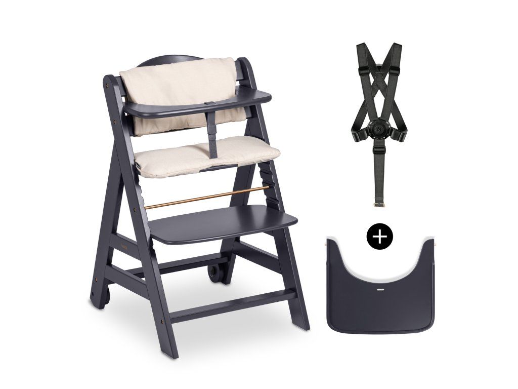 Priestranná drevená tácka poskytuje dostatok priestoru na stolovanie aj hranie, prípadne sa dá tácka vymeniť za praktický ochranný oblúk. Priložené polstrovanie poskytuje vášmu dieťaťu dostatok pohodlia pri sedení, stolovaní alebo hraní.