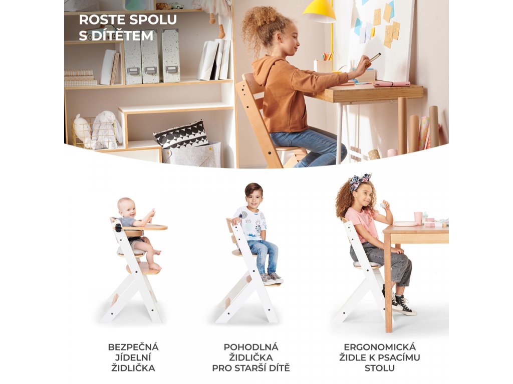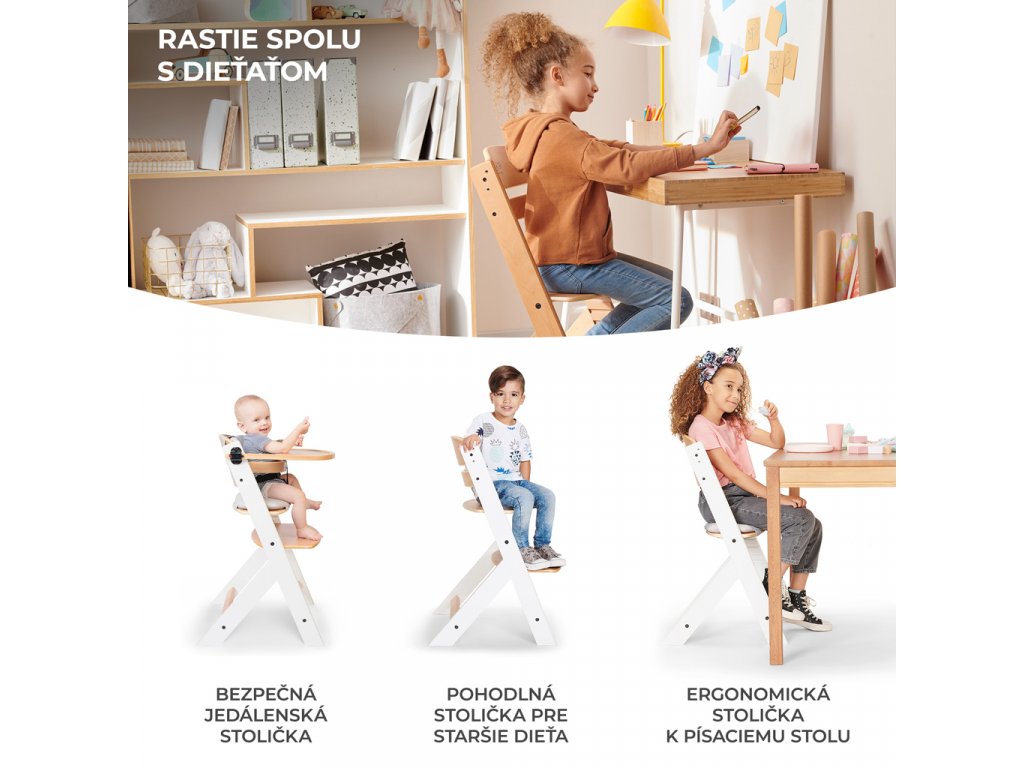 Existuje vôbec vysoká stolička na kŕmenie, ktorá bude slúžiť dieťaťu niekoľko rokov? Áno! Takou stoličkou je práve ENOCK. Tento nadčasový kus nábytku je bezpečnou a praktickou stoličkou na kŕmenie a ergonomickou stoličkou pre staršie deti. Ako je to možné? Výška sedadla a opierky nohy sú nastaviteľné, čo uľahčuje nastavenie vysokej stoličky podľa veku dieťaťa. ENOCK je navrhnutý pre vašu rodinu - je to stolička, ktorá sa zmestí do interiéru vášho domova a neskôr bude slúžiť vášmu dieťaťu ako detská stolička alebo stolička k pracovnému stolu. A čo viac - bez problémov ju zladíte so stolom v kuchyni, jedálni alebo v obývacej izbe. Vďaka profilovanej základni si dieťa zachová správne držanie tela pri jedle a bude tiež schopné tráviť čas spolu s dospelými pri stole.Výhody