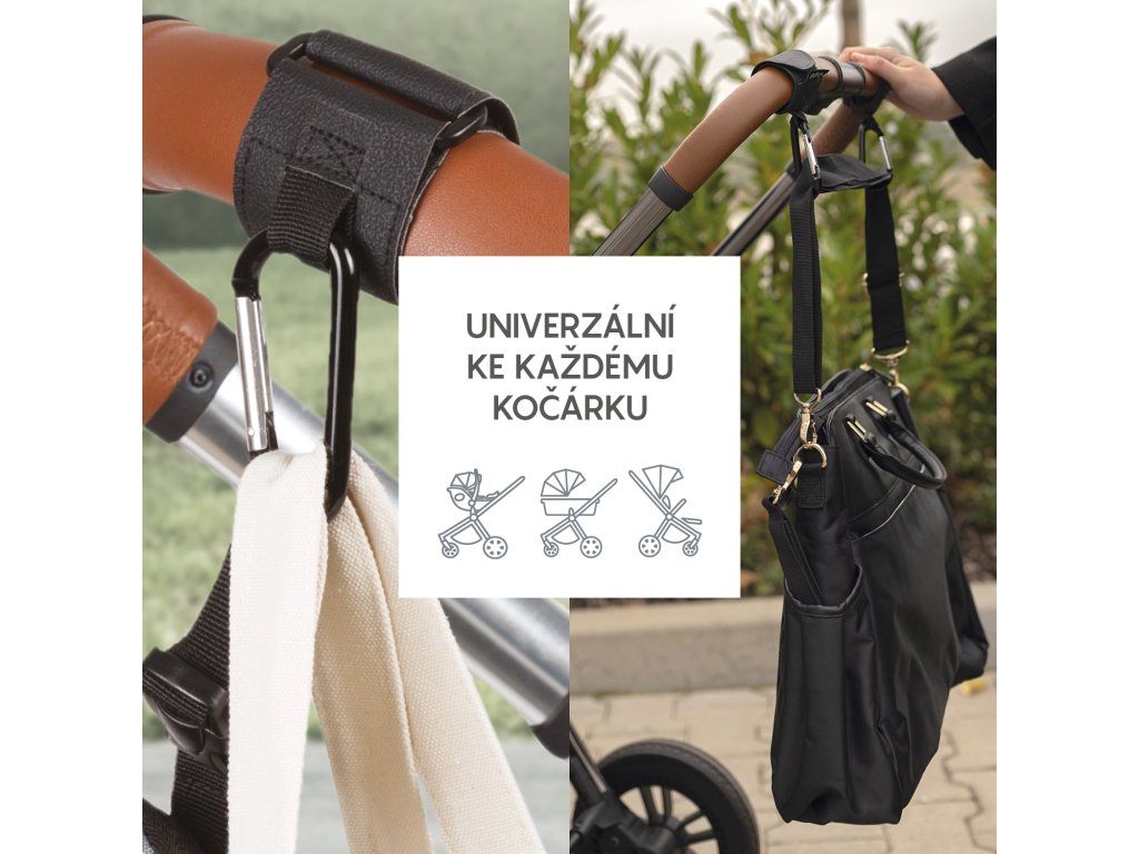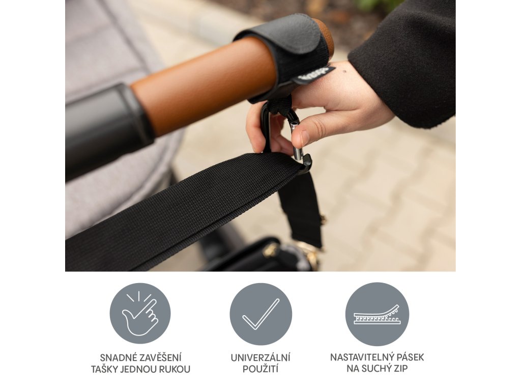 Popruh s klipom je vhodný pre každý typ kočíka. Jednoduchá inštalácia pomocou suchého zipsu. Vďaka pevnej kovovej spone bude vaša taška vždy bezpečne pripevnená k rukoväti.
