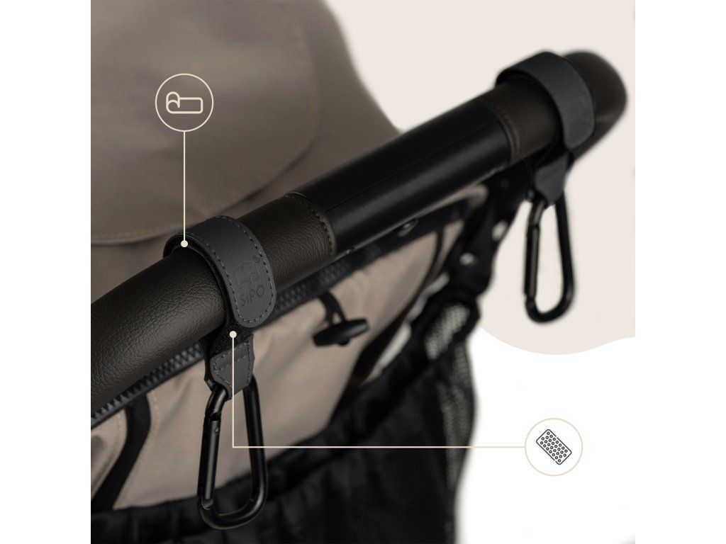 Háčiky na kočík SIPO sú praktickým doplnkom, ktorý uľahčuje prenášanie tašiek, nákupu alebo organizéru pre deti. Robustná konštrukcia pozostáva z matnej kovovej karabíny a PU koženého remienka, ktorý zaisťuje odolnosť a stabilitu aj pri každodennom používaní. Vďaka univerzálnemu dizajnu a elegantnému vzhľadu sú háčiky kompatibilné so všetkými typmi kočíkov – so športovými aj s hlbokými.