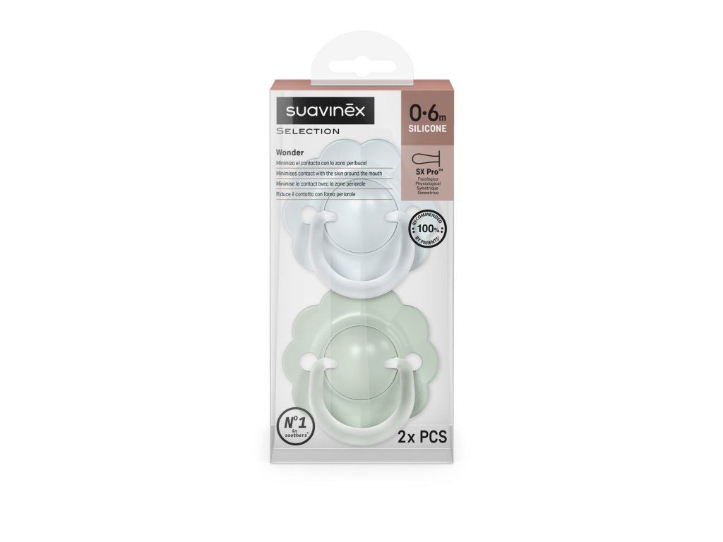 Dudlíky Wonderland sú vybavené fyziologickou cumlíkovou časťou SX Pro zo silikónu, ktorá rešpektuje prirodzený vývoj ústnej dutiny dieťaťa. Vďaka plochému a symetrickému tvaru sa vždy správne prispôsobí v ústach.