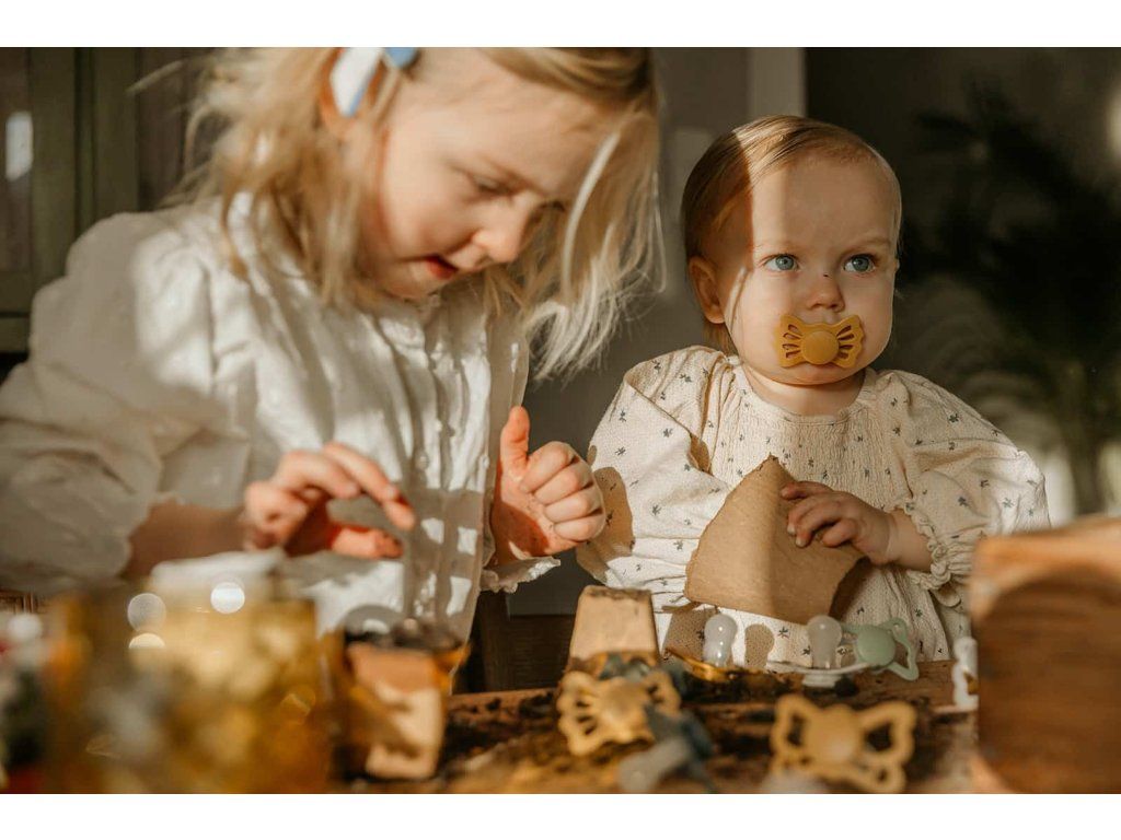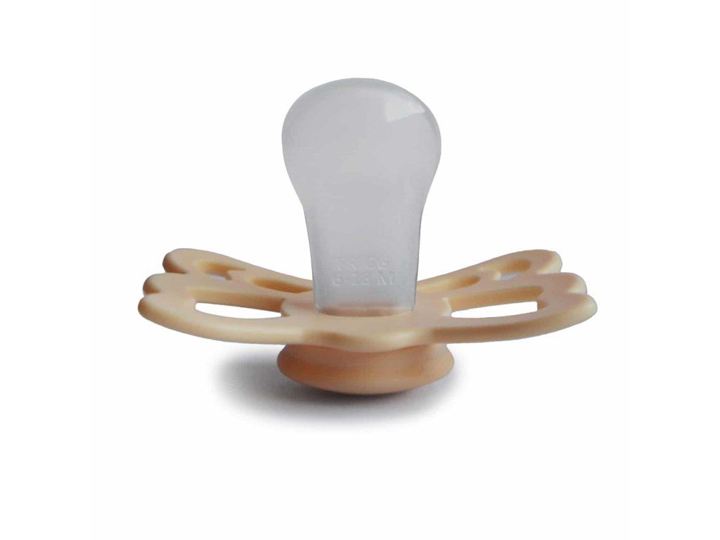Tvar cumlíka FRIGG Butterfly pripomína motýľa. Štít so zvlnenými okrajmi má veľké vzduchové otvory pre väčšiu bezpečnosť a jeho okrúhly stred krásne zvýrazňuje eleganciu cumlíka.