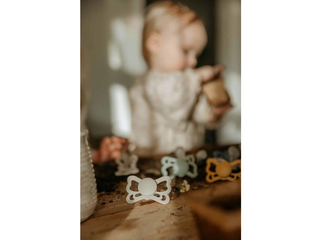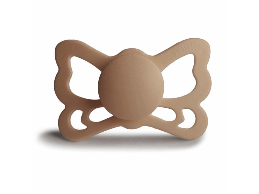 Tvar cumlíka FRIGG Butterfly pripomína motýľa. Štít so zvlnenými okrajmi má veľké vzduchové otvory pre väčšiu bezpečnosť a jeho okrúhly stred krásne zvýrazňuje eleganciu cumlíka.