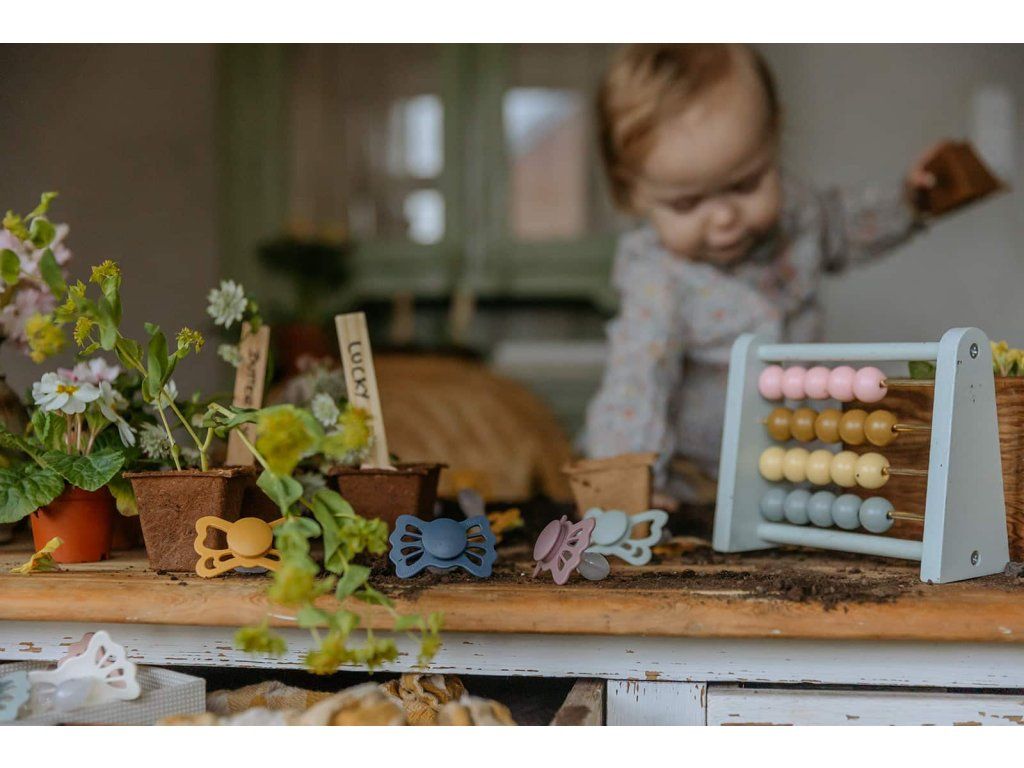 Tvar cumlíka FRIGG Butterfly pripomína motýľa. Štít so zvlnenými okrajmi má veľké vzduchové otvory pre väčšiu bezpečnosť a jeho okrúhly stred krásne zvýrazňuje eleganciu cumlíka.
