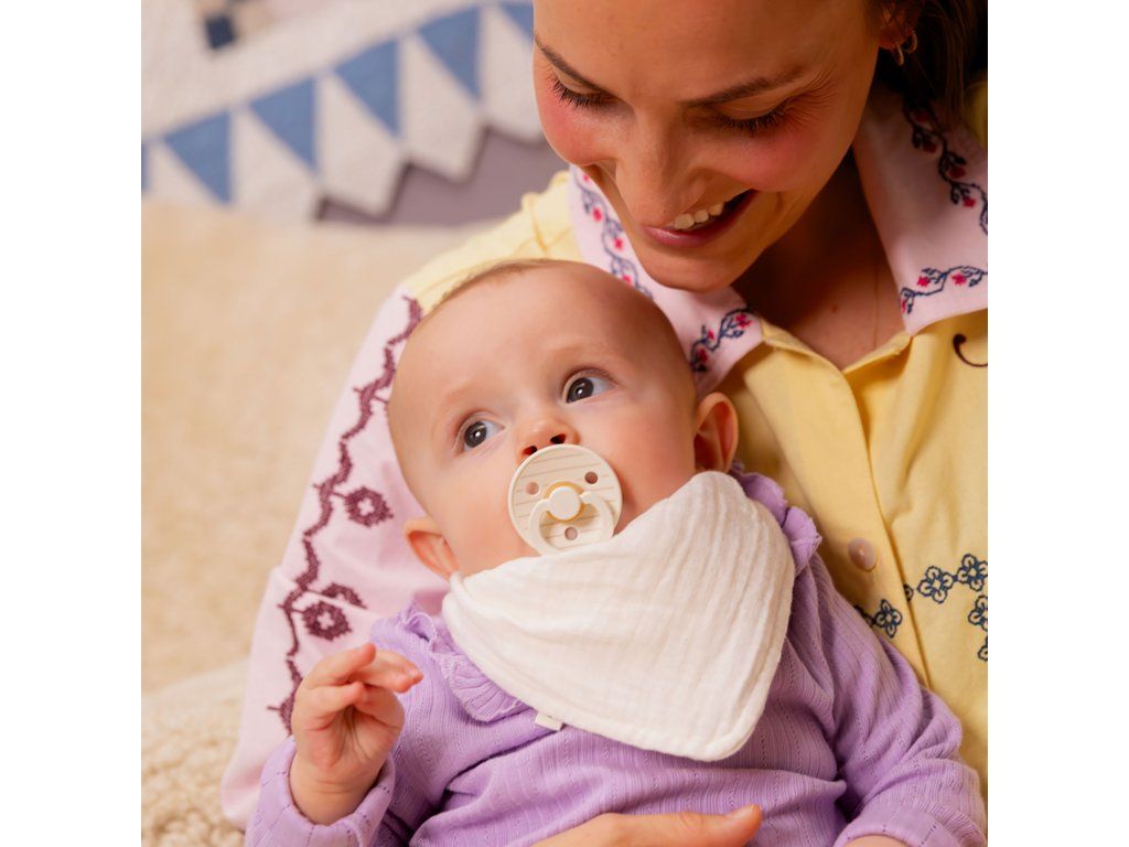 Kolekcia BIBS STUDIO prináša svieži vietor do sveta detských produktov. Experimentuje s dizajnovou potlačou obľúbených cumlíkov a vytvára priestor na vyjadrenie Vášho jedinečného štýlu.Sacia časť BIBS STUDIO Colour cumlíkov je vyrobená zo 100% prírodného kaučuku, ktorý je mimoriadne pružný a mäkký zároveň, odolný voči vytvoreniu trhlín a odštiepeniu malých kúskov. Cumlík je navrhnutý tak, aby nedráždil citlivú pokožku bábätka. Okrúhly krúžok s vetracími otvormi má klenutý tvar, takmer vôbec sa nedotýka pokožky okolo úst, tá preto zostáva kľudná, bez otlačkov a podráždení. Vďaka mäkučkému kaučuku a zabudovanému vzduchovému ventilu dieťa cumlík ľahko stláča a formuje v ústach, čím je zachovaný prirodzený vývin podnebia, ďasien a zúbkov detí.Prečo deti aj rodičia obľubujú cumlíky BIBS Colour? Extra ľahučký. Vďaka špeciálnemu klenutému tvaru krúžku je minimalizovaný dotyk cumlíka s pokožkou a nevznikajú otlačky a podráždenia. Guľatý / čerešničkový tvar sacej časti si často obľúbia aj deti, ktoré odmietajú iné tvary cumlíka. Dieťa saje len 100% prírodný bezpečný materiál – kaučuk vyrobený z miazgy stromu Hevea. Výnimočná chuť prírodného kaučuku, deti ho prirodzene uprednostňujú pred syntetickými materiálmi. Štýlový dizajn v mnohých farebných prevedeniach. Vyrobené v EU. Zloženie : Sacia časť: 100% prírodný kaučuk Ostatné časti: polypropylén (PP) potravinárskej kvality. Bez BPA, PVC, ftalátov a iných škodlivých látok. Vyrobené v Dánsku. V súlade s európskym štandardom EN 1400+A2.Dodatočné parametre