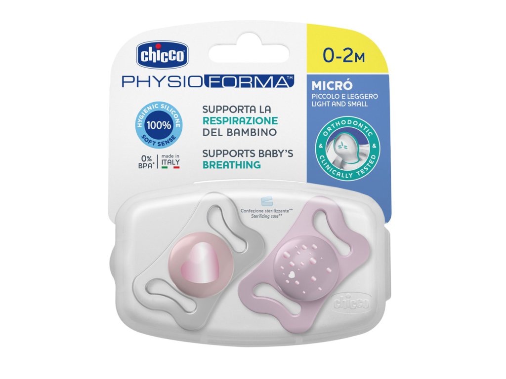 Cumlík Chicco Micro je špeciálne navrhnutý ortodontický cumlík pre prvé mesiace života novorodenca.Vyrobené zo silikónu čo je hygienický, praktický materiál, ktorý sa nedeformuje. Vďaka exkluzívnej povrchovej úprave SOFT SENSE je mäkký a zamatový. Cumlík Chicco PhysioForma Micrò 0-2m vďaka svojmu exkluzívnemu tvaru podporuje správny vývoj úst a pomáha umiestniť jazyk dopredu, čím podporuje fyziologické dýchanie.