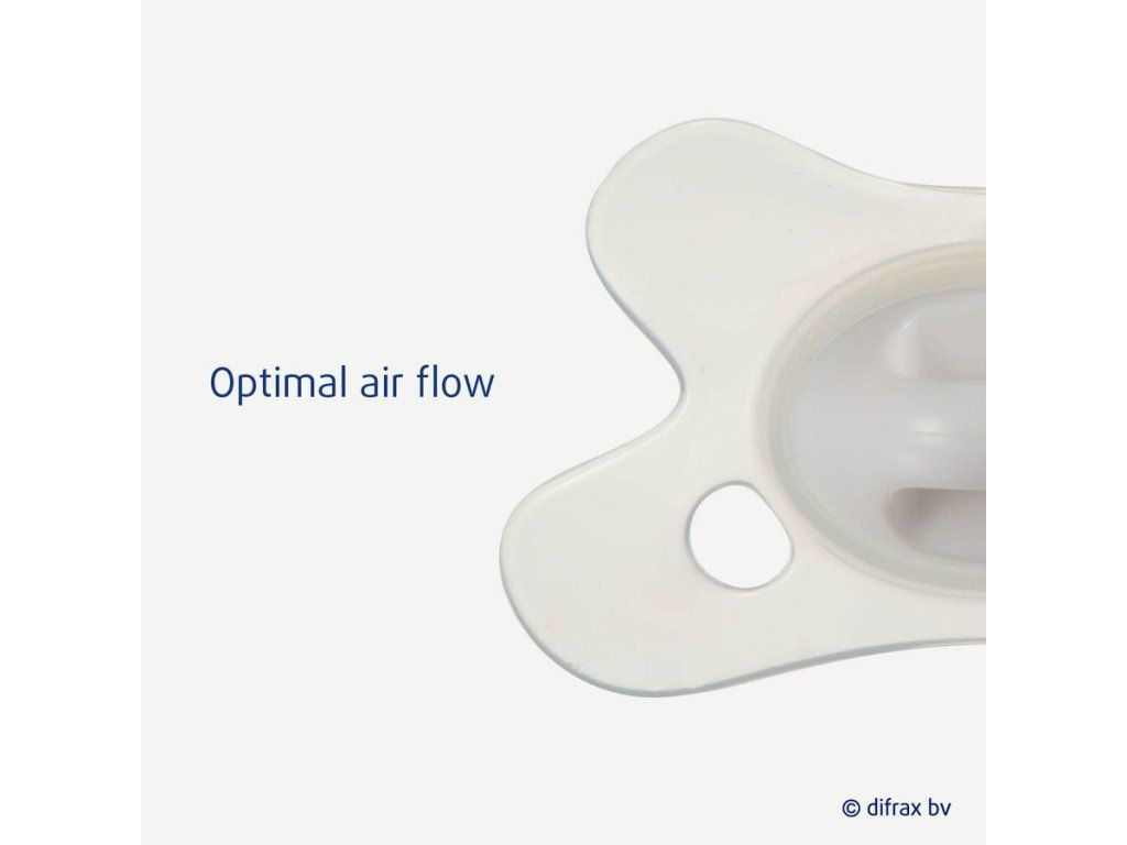 Unikátny cumlík Difrax má kotúč v tvare motýľa, ktorý zaistí, že sa cumlík dokonale prispôsobí tvaru tváre Vášho dieťatka. Vykrojenie kotúča umožňuje bábätku voľné dýchanie nosom. Dva prídavné otvory zabezpečujú dostatočný priechod vzduchu, čím obmedzujú možnosť podráždenia pokožky bábätka. Cumlík dodáva dieťatku pocit pohodlia, útechy a uvoľnenia. Difrax cumlíky sú navyše dostupné v niekoľkých populárnych prevedeniach a v rôznych farbách.