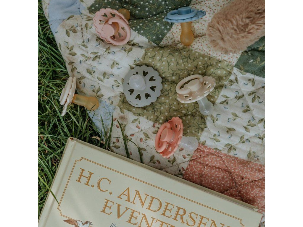 Cumlík je vyrobený z prírodného kaučuku, pričom jeho tvar je zakrivený jemne smerom von, aby sa zabránilo podráždeniu pokožky. Každý cumlík je strojovo testovaný na závadnosť, aby sa k našim najdôležitejším zákazníkom dostal vždy perfektný produkt. Tvar štítu je zakrivený jemne smerom von, aby sa zabránilo podráždeniu pokožky. Pre väčšiu bezpečnosť sú v štíte prítomné vzduchové otvory. Nový Click-lock™ systém odlišuje cumlík FRIGG od akéhokoľvek iného cumlíku na trhu. Vďaka novému 4-krokovému procesu spájania jednotlivých častí cumlíka je možné cumlík zostaviť jednoduchým kliknutím, bez použitia akejkoľvek sily. Vďaka tomu je cumlík ešte odolnejší ako predtým. FRIGG je 100% dizajnovaný a vyrobený v Dánsku ako jediná značka cumlíkov na svete! Každý cumlík je zároveň vyrobený na princípe zero-waste, čím sa minimalizuje odpad materiálu vďaka možnosti recyklácie. Cumlíky sú vyrábané s maximálny ohľadom na životné prostredie, a zároveň s dôrazom na uspokojenie potrieb najmenších detí. FRIGG kladie dôraz aj na bezpečnosť - cumlíky sú vyrábané bez BPA, PVC a ftalátov, každý cumlík podstupuje stretch a vacuum test pred uvedením do predaja a sú vyrábané podľa najprísnejšej normy EN1400-A2. Spoznajte svet značky FRIGG, inšpirovaný bohyňou zeme, vzduchu a plodnosti podľa severskej mytológie a nechajte sa zlákať dokonalosťou tvarov a farieb. Kolekcia cumlíkov FRIGG Fairytale je inšpirovaná umeleckou tvorbou dánskeho autora H.C. Andersena. Vrúbkované okraje a malé srdiečka vo vnútri štítu napodobňujú jeden z jeho papierových výstrižkov. Každá farba cumlíka je pomenovaná podľa jeho známych rozprávok, ktoré dodávajú cumlíkom nádych fantázie. Tento mimoriadne krásny cumlík, s moderným dizajnom a elegantnými detailmi, upúta pozornosť každej štýlovej mamičky. Vlastnosti:- 100% navrhnuté v Dánsku
