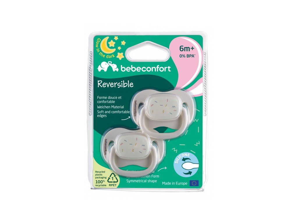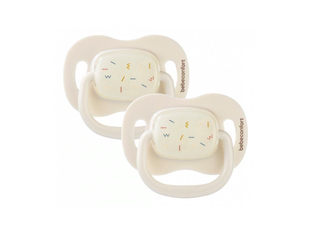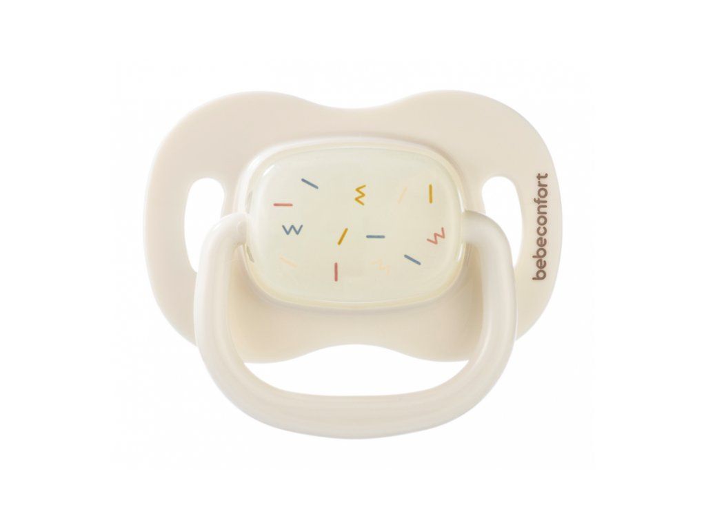 Cumlík so symetrickým cumlíkom z mäkkého silikónu. Vonkajšia časť cumlíka má otvory na cirkuláciu vzduchu, aby nedošlo k podráždeniu citlivej pokožky okolo úst. Cumlík v tme svetielkuje, takže ho ľahko nájdete aj v noci v postieľke.