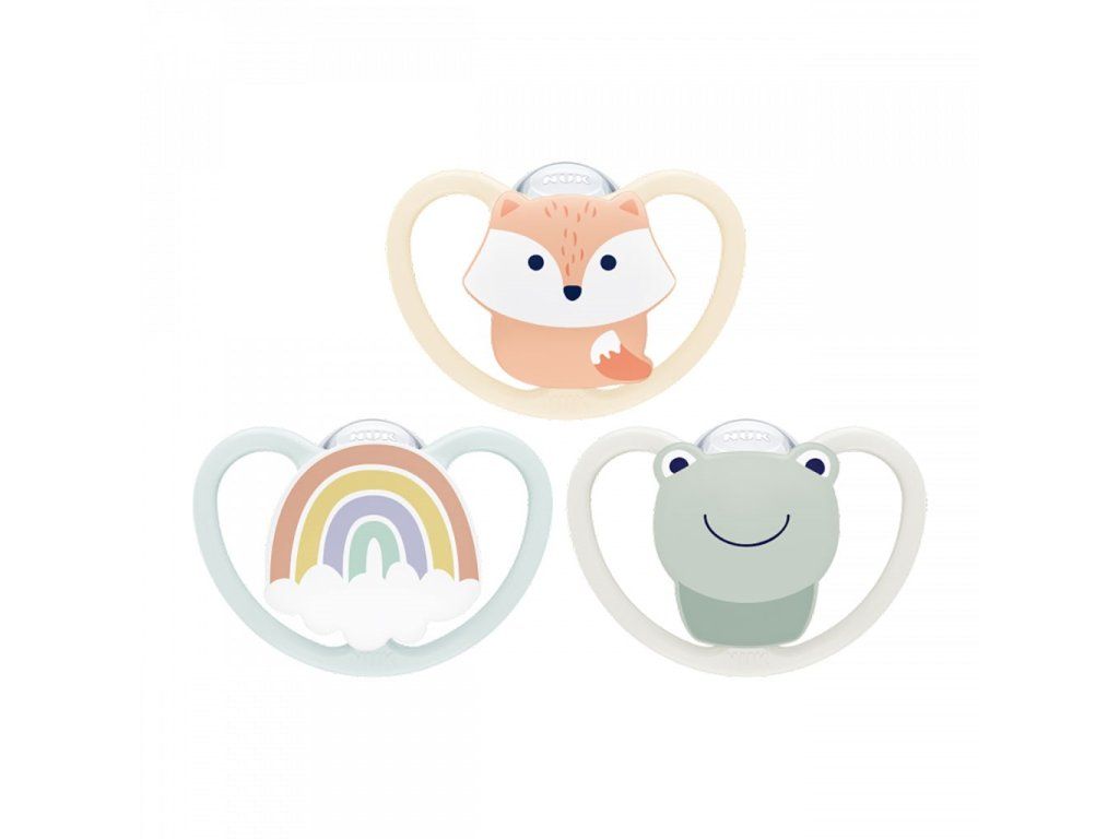 Dojčenský silikónový cumlík NUK Space 1 / box 0-6 mesiacov s krásnym farebným obrázkom zvieratka. Nový cumlík Space s inovatívnym, moderným dizajnom umožňuje jemnej detskej pokožke dýchať. Špeciálne určený pre citlivú pokožku dieťaťa a má robustný, znovu použiteľný box pre uskladnenie, prepravu a hygienickú sterilizáciu v mikrovlnnej rúre. Cumlík je vyrobený z vysoko kvalitného plastu a silikónového cumlíka. Výhodou silikónu je to, že je bez zápachu a ľahko sa čistí. Neobsahuje BPA. Všetky NUK cumlíky sú pravidelne testované a sledované nezávislými inštitútmi.Dodatočné parametre