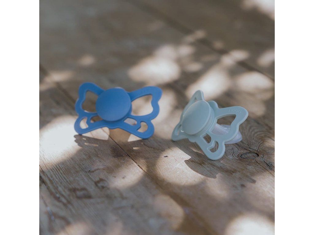 FRIGG Butterfly tvarom pripomína motýľa. Štít so zvlnenými okrajmi má veľké vzduchové otvory a v pristriedku nájdete okrúhly stred, ktorý zvýrazňuje eleganciu cumlíka. Cumlík je inšpirovaný krásnym motýľom. Nielen svojím vzhľadom, ale aj myšlienkou magickej premeny. Aby sa húsenica stala motýľom, prechádza procesom transformácie. Počas tohto procesu húsenica zostáva v kukle a nakoniec rozkvitne ako krásny motýľ. Táto magická premena je symbolom rozvoja života. Aj dieťatko prechádza rôznymi vývojovými štádiami v matkinom lone a na konci transformačného procesu sa dieťa narodí, aby rozkvitlo vo veľkom svete. FRIGG Butterfly je anatomický cumlík s cumíkom, ktorý kopíruje tvar úst. Cumlík je navrhnutý tak, aby vyvíjal menší tlak na podnebie, ďasná a čeľuste a je to najšetrnejší typ cumlíka. Tým sa znižuje riziko krivých zubov a krivého zhryzu. Ortodontický dizajn je ideálny na podporu správneho vývoja detských zubov, čeľuste a podnebia. Detaily cumlíka FRIGG- 100% navrhnuté v Dánsku