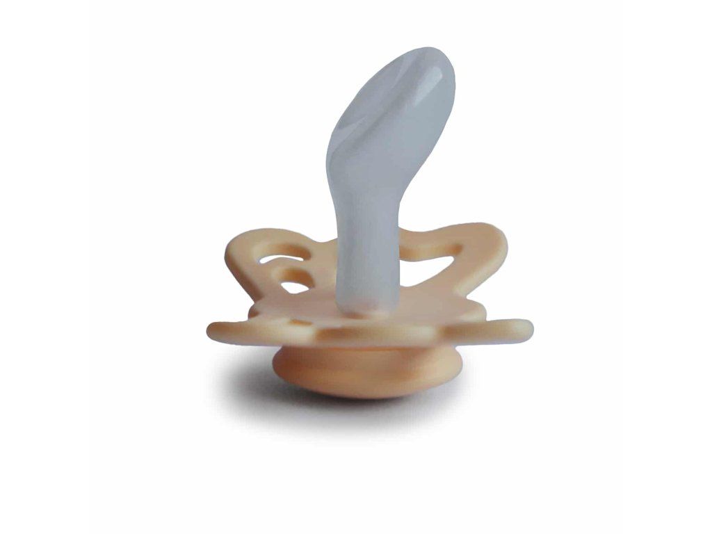 FRIGG Butterfly sú anatomické cumlíky, ktoré kopírujú tvar úst. Cumlíky sú špeciálne navrhnuté tak, aby vyvíjali menší tlak na podnebie, ďasná a čeľuste, vďaka čomu sa zaraďujú k najšetrnejším typom cumlíkov. Tým sa znižuje riziko vývoja krivých zubov. Ortodontický dizajn je ideálny na podporu správneho vývoja detských zúbkov, čeľuste a podnebia. Cumlíky sú vyrobené zo silikónu medicínskeho stupňa s novým povrchom SilkySoft™, ktorý predstavuje najvyššiu kvalitu silikónu s ešte mäkším povrchom ako predtým, pre prirodzenejšie satie a ešte bezpečnejšiu voľbu pre detské podnebie a ďasná. Každý cumlík je strojovo testovaný na závadnosť, aby sa k našim najdôležitejším zákazníkom dostal vždy perfektný produkt. Tvar cumlíkov FRIGG Butterfly pripomína motýľa. Štít so zvlnenými okrajmi má veľké vzduchové otvory pre väčšiu bezpečnosť a jeho okrúhly stred krásne zvýrazňuje eleganciu cumlíkov. Nový Click-lock™ systém odlišuje cumlíky FRIGG od akéhokoľvek iného cumlíkov na trhu. Vďaka novému 4-krokovému procesu spájania jednotlivých častí cumlíkov je možné cumlíky zostaviť jednoduchým kliknutím, bez použitia akejkoľvek sily. Vďaka tomu sú cumlíky ešte odolnejšie ako predtým. FRIGG je 100% dizajnovaný a vyrobený v Dánsku ako jediná značka cumlíkov na svete! Každý cumlík je zároveň vyrobený na princípe zero-waste, čím sa minimalizuje odpad materiálu vďaka možnosti recyklácie. Cumlíky sú vyrábané s maximálny ohľadom na životné prostredie, a zároveň s dôrazom na uspokojenie potrieb najmenších detí. FRIGG kladie dôraz aj na bezpečnosť - cumlíky sú vyrábané bez BPA, PVC a ftalátov, každý cumlík podstupuje stretch a vacuum test pred uvedením do predaja a sú vyrábané podľa najprísnejšej normy EN1400-A2. Cumlíky FRIGG Butterfly sú inšpirované krásnym motýľom. Nielen svojím vzhľadom, ale aj magickou premenou. Aby sa húsenica stala motýľom, prechádza procesom transformácie. Počas tohto procesu húsenica zostáva v kukle a nakoniec rozkvitne ako krásny motýľ. Táto magická premena je symbolom rozvoja života. Aj dieťatko prechádza rôznymi vývojovými štádiami v matkinom lone a na konci transformačného procesu sa dieťa narodí, aby rozkvitlo vo veľkom svete. Spoznajte svet značky FRIGG, inšpirovaný bohyňou zeme, vzduchu a plodnosti podľa severskej mytológie a nechajte sa zlákať dokonalosťou tvarov a farieb. Vlastnosti:- 100% navrhnuté v Dánsku