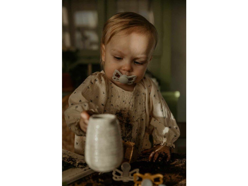FRIGG Butterfly sú anatomické cumlíky, ktoré kopírujú tvar úst. Cumlíky sú špeciálne navrhnuté tak, aby vyvíjali menší tlak na podnebie, ďasná a čeľuste, vďaka čomu sa zaraďujú k najšetrnejším typom cumlíkov. Tým sa znižuje riziko vývoja krivých zubov. Ortodontický dizajn je ideálny na podporu správneho vývoja detských zúbkov, čeľuste a podnebia. Cumlíky sú vyrobené zo silikónu medicínskeho stupňa s novým povrchom SilkySoft™, ktorý predstavuje najvyššiu kvalitu silikónu s ešte mäkším povrchom ako predtým, pre prirodzenejšie satie a ešte bezpečnejšiu voľbu pre detské podnebie a ďasná. Každý cumlík je strojovo testovaný na závadnosť, aby sa k našim najdôležitejším zákazníkom dostal vždy perfektný produkt. Tvar cumlíkov FRIGG Butterfly pripomína motýľa. Štít so zvlnenými okrajmi má veľké vzduchové otvory pre väčšiu bezpečnosť a jeho okrúhly stred krásne zvýrazňuje eleganciu cumlíkov. Nový Click-lock™ systém odlišuje cumlíky FRIGG od akéhokoľvek iného cumlíkov na trhu. Vďaka novému 4-krokovému procesu spájania jednotlivých častí cumlíkov je možné cumlíky zostaviť jednoduchým kliknutím, bez použitia akejkoľvek sily. Vďaka tomu sú cumlíky ešte odolnejšie ako predtým. FRIGG je 100% dizajnovaný a vyrobený v Dánsku ako jediná značka cumlíkov na svete! Každý cumlík je zároveň vyrobený na princípe zero-waste, čím sa minimalizuje odpad materiálu vďaka možnosti recyklácie. Cumlíky sú vyrábané s maximálny ohľadom na životné prostredie, a zároveň s dôrazom na uspokojenie potrieb najmenších detí. FRIGG kladie dôraz aj na bezpečnosť - cumlíky sú vyrábané bez BPA, PVC a ftalátov, každý cumlík podstupuje stretch a vacuum test pred uvedením do predaja a sú vyrábané podľa najprísnejšej normy EN1400-A2. Cumlíky FRIGG Butterfly sú inšpirované krásnym motýľom. Nielen svojím vzhľadom, ale aj magickou premenou. Aby sa húsenica stala motýľom, prechádza procesom transformácie. Počas tohto procesu húsenica zostáva v kukle a nakoniec rozkvitne ako krásny motýľ. Táto magická premena je symbolom rozvoja života. Aj dieťatko prechádza rôznymi vývojovými štádiami v matkinom lone a na konci transformačného procesu sa dieťa narodí, aby rozkvitlo vo veľkom svete. Spoznajte svet značky FRIGG, inšpirovaný bohyňou zeme, vzduchu a plodnosti podľa severskej mytológie a nechajte sa zlákať dokonalosťou tvarov a farieb. Vlastnosti:- 100% navrhnuté v Dánsku