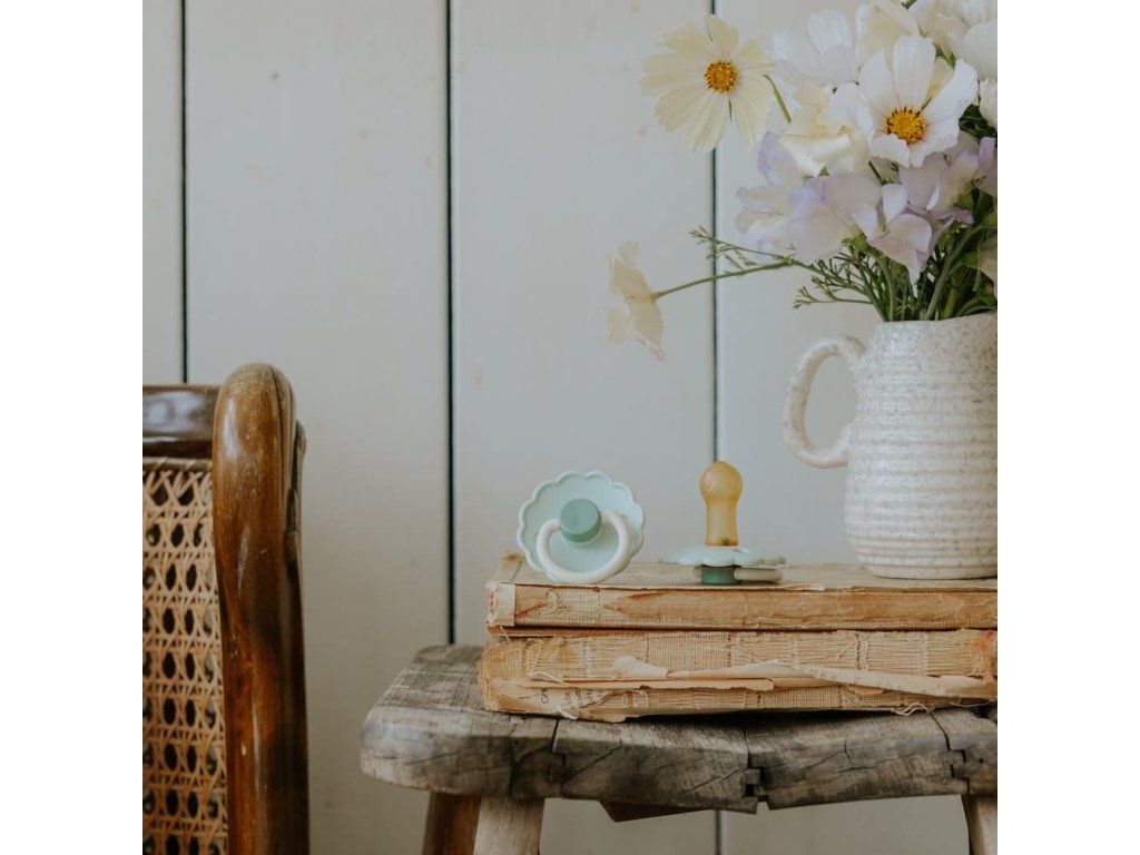 Cumlíky FRIGG Daisy s jemne vrúbkovanými okrajmi pripomínajúcimi lupene kvetov sú esenciou klasickej elegancie a moderného štýlu. Ich premyslený dizajn osloví každú mamičku, ktorá hľadá nielen funkčnosť, ale aj estetiku pri výbere doplnkov pre svoje bábätko. Cumlíky sú dostupné v jednofarebných aj kombinovaných variantoch, ktoré sa dokonale hodia ku každodennému štýlu. Cumlík FRIGG Daisy má okrúhly tvar, ktorý verne napodobňuje materinský prsník. Tento tvar:- podporuje prirodzený sací reflex – jazyk sa počas sania prirodzene obopína okolo cumlíka, ako pri dojčení,