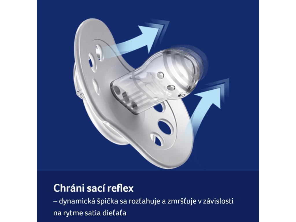 Dynamická špička je vyrobená z homogénnej silikónovej vrstvy, ktorá umožňuje zmršťovanie a rozťahovanie pri saní dieťaťa.