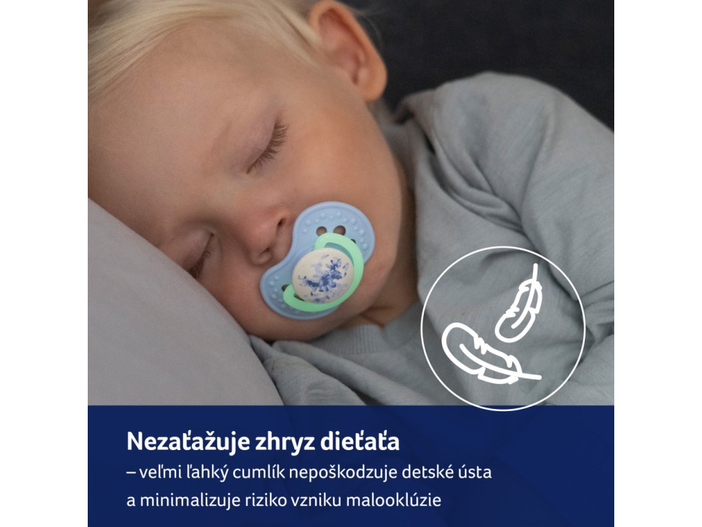 Veľmi ľahký cumlík, ktorý nezaťažuje detské ústa a minimalizuje tak riziko vzniku krivých zubov (malooklúzia).