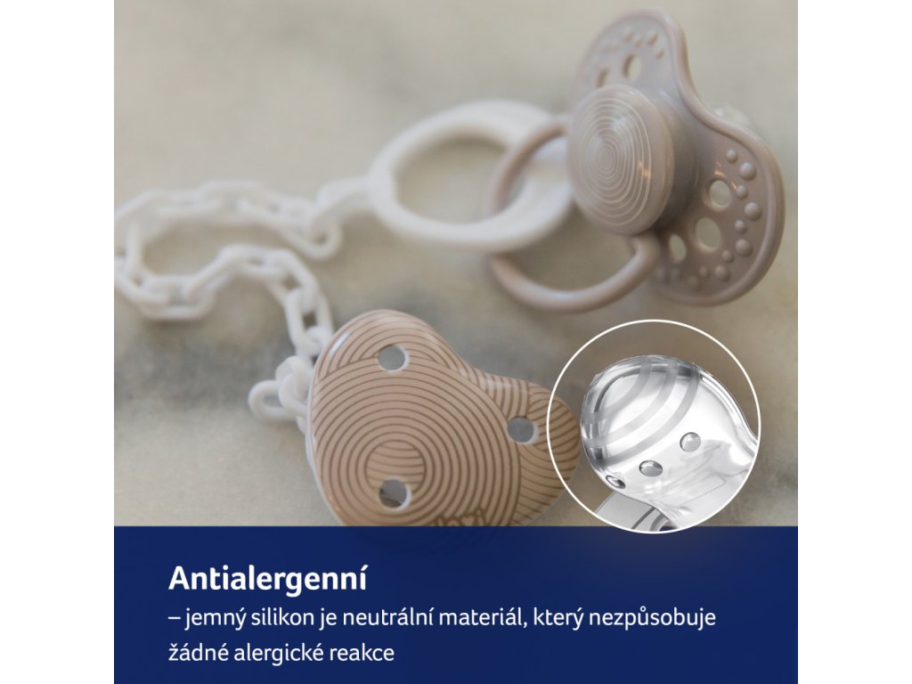 Jeho tvar umožňuje dieťaťu ľahko dýchať nosom; sú použité bezpečné materiálu bez bisfenolu A.