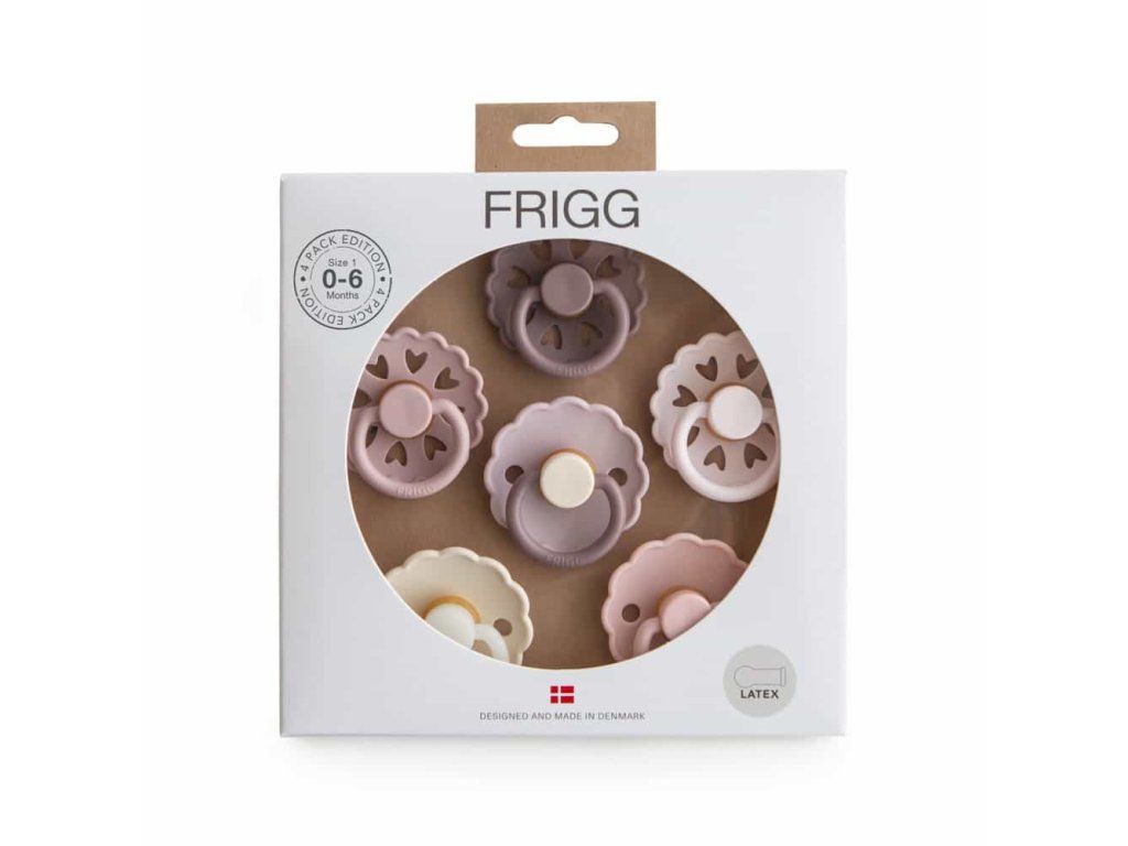 Všetky cumlíky v 6-baleniach FRIGG sú cumlíky s okrúhlym tvarom cumlíka. Okrúhly cumlík tvarom aj materiálom pripomína materinský prsník. Vysvetlením je, že keď sa dieťa chystá dojčiť, jazyk sa zroluje okolo bradavky a vytvorí podtlak, ktorý spôsobí tok mlieka. Keď dieťa saje okrúhly cumlík, gúľa okolo neho jazyk rovnako. Okrúhly tvar odporúčajú detskí chiropraktici a pôrodnice v Dánsku. FRIGG predstavuje „Blooming Love“ 6-balenie: Šesťbalenie „Blooming Love“ od FRIGG, balenie pozostávajúce zo 6 okrúhlych cumlíkov v krásnych kvetinových odtieňoch. „Blooming Love“ je paleta prírody, ktorá maľuje svet v odtieňoch stále rastúcej lásky. Jedným z cumlíkov je cumlík FRIGG Night, má funkciu svietenia v tme. Rukoväť a gombík budú svietiť v tme a vyriešia problém nájsť a umiestniť cumlík vášho dieťaťa uprostred noci. Funkcia nočného žiarenia je jemne jasná a nepoškodí oči vášho dieťaťa a cumlík môžete ľahko nájsť bez zapnutia svetla. Podržte cumlík vo svetle, aby ste aktivovali funkciu žiary. FRIGG 6-balenie Blooming Love obsahuje:- 1 ks FRIGG Daisy okrúhly cumlík vo farbe: Lavender Haze