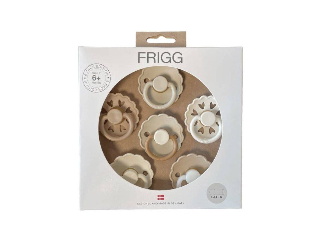 Všetky cumlíky v 6-baleniach FRIGG sú cumlíky s okrúhlym tvarom cumlíka. Okrúhly cumlík tvarom aj materiálom pripomína materinský prsník. Vysvetlením je, že keď sa dieťa chystá dojčiť, jazyk sa zroluje okolo bradavky a vytvorí podtlak, ktorý spôsobí tok mlieka. Keď dieťa saje okrúhly cumlík, gúľa okolo neho jazyk rovnako. Okrúhly tvar odporúčajú detskí chiropraktici a pôrodnice v Dánsku. FRIGG predstavuje „Cinnamon Charm“ 6-balenie: Šesťbalenie „Cinnamon Charm“ od FRIGG, balenie pozostávajúce zo 6 okrúhlych cumlíkov v teplých farbách, ktoré dokonale ladia s paletou prírody. Vyberte si „Cinnamon Charm“ pre útulnú eleganciu a nadčasový šarm. Jedným z cumlíkov je cumlík FRIGG Night, má funkciu svietenia v tme. Rukoväť a gombík budú svietiť v tme a vyriešia problém nájsť a umiestniť cumlík vášho dieťaťa uprostred noci. Funkcia nočného žiarenia je jemne jasná a nepoškodí oči vášho dieťaťa a cumlík môžete ľahko nájsť bez zapnutia svetla. Podržte cumlík vo svetle, aby ste aktivovali funkciu žiary. FRIGG 6-balenie Cinnamon Charm obsahuje:- 1ks FRIGG Fairytale okrúhly cumlík vo farbe: The Emperors New Clothes (Silky Satin)