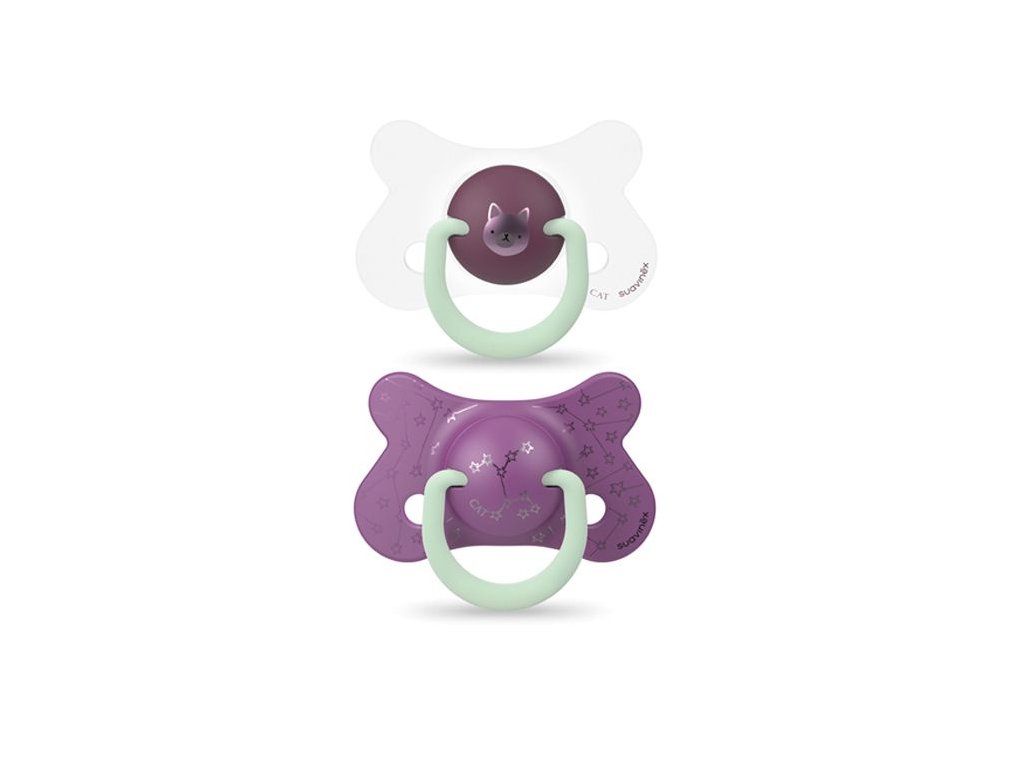 SUAVINEX | Cumlík DEŇ&NOC fyziologické silikón +18m 2ks - fialová mačka