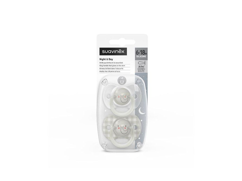 SUAVINEX | Cumlík DEŇ&NOC fyziologický silikón 6-18 m 2ks - sivý slon