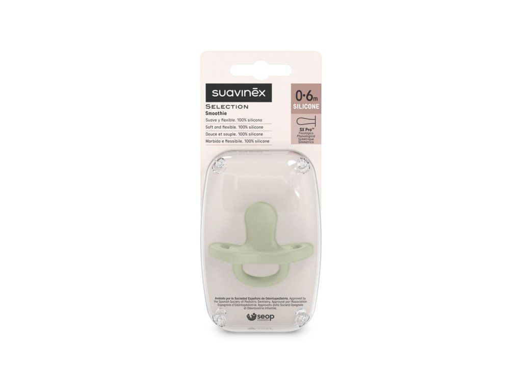 Mäkučký celosilikónový cumlík Colour essence sx pro od značky Suavinex v pastelových farbách - vyrobený z jedného kusu silikónu, s ergonomickým štítkom, ktorý sa prirodzene adaptuje s potrebami detí, bez chuti a bez zápachu. Ponecháva jazyku viac miesta v ústnej dutine, aby bolo sanie čo anprirodzenejšie.