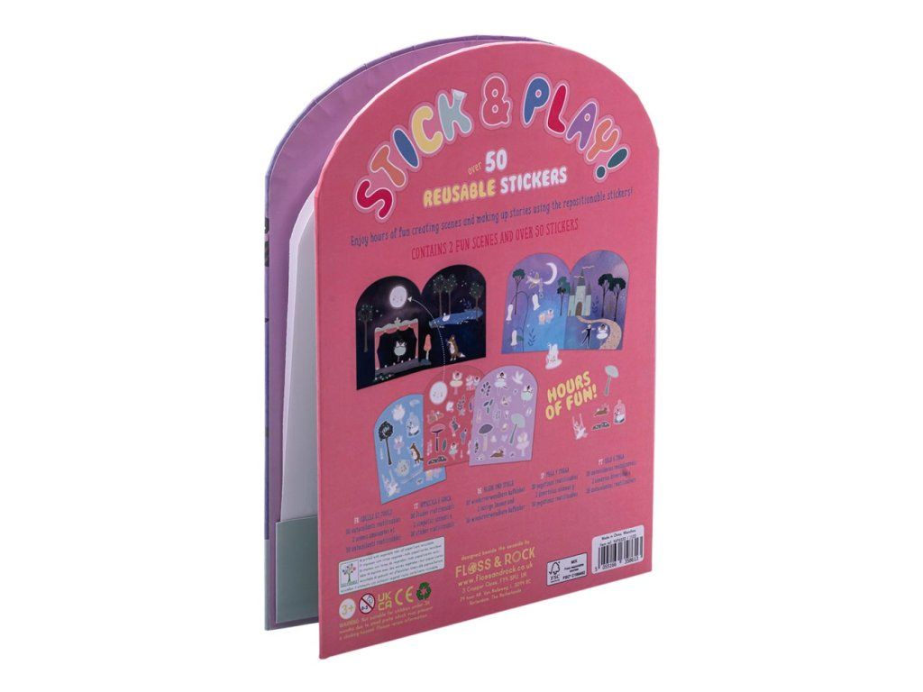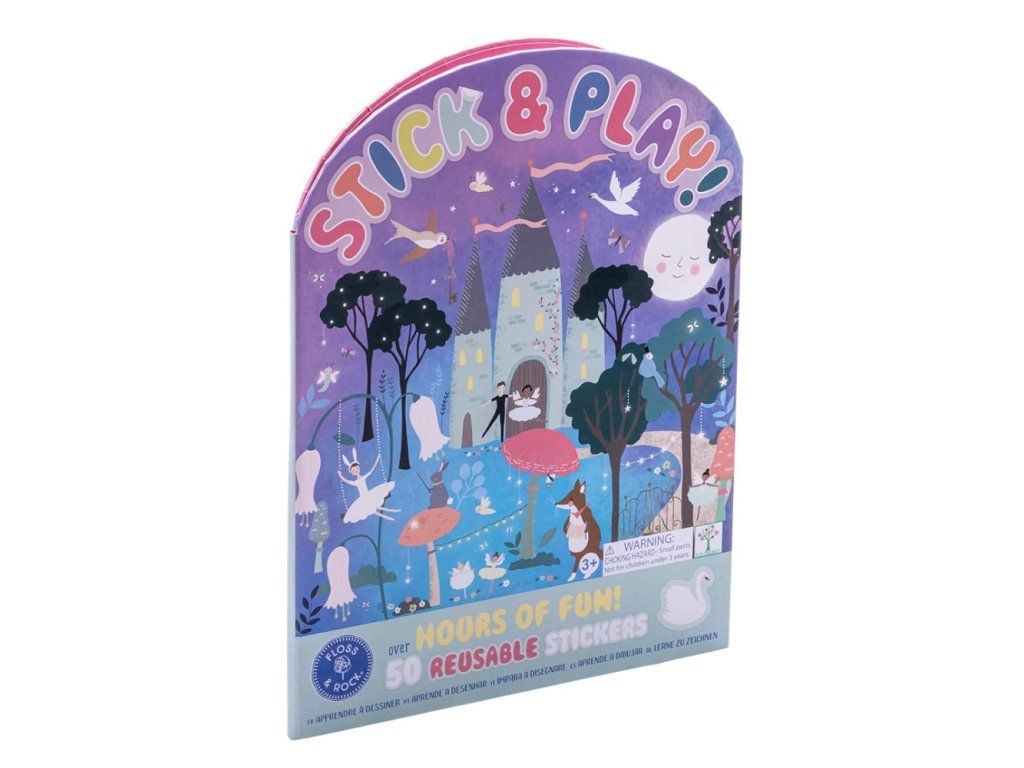 Zošit s nálepkami Floss&Rock Stick & Play je zábavná a zároveň náučná. S viac ako 50timi tvarovanými opakovane použiteľnými nálepkami. K dispozícii sú 2 rozkladacie scény na vytváranie a vymýšľanie príbehov pomocou nálepiek. Na zadnej strane je oddelená časť, kde priraďujete nálepky k ich tvaru. Toto zabaví najmenších na celé hodiny! Pevná zadná časť knihy sa dá zložiť úplne naplocho, vďaka čomu je ideálna na cestovanie.Obsahuje: 50x opakovane použiteľných nálepiek, 2x scéna, 1xzošit