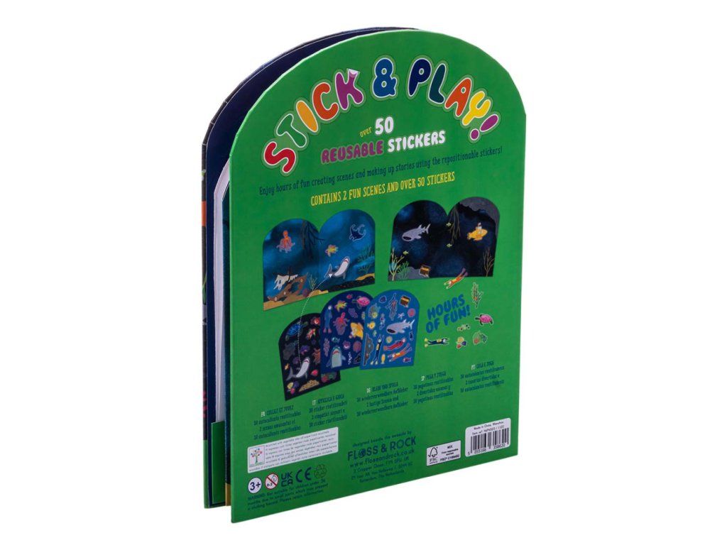 Zošit s nálepkami Floss&Rock Stick & Play je zábavná a zároveň náučná. S viac ako 50timi tvarovanými opakovane použiteľnými nálepkami. K dispozícii sú 2 rozkladacie scény na vytváranie a vymýšľanie príbehov pomocou nálepiek. Na zadnej strane je oddelená časť, kde priraďujete nálepky k ich tvaru. Toto zabaví najmenších na celé hodiny! Pevná zadná časť knihy sa dá zložiť úplne naplocho, vďaka čomu je ideálna na cestovanie.Obsahuje: 50x opakovane použiteľných nálepiek, 2x scéna, 1xzošit