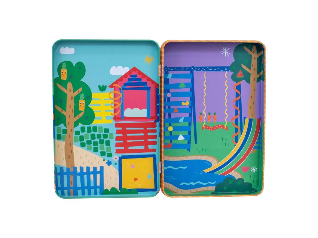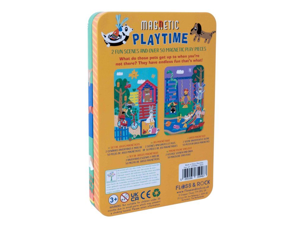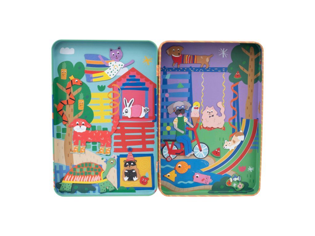 Zábava pri hraní v praktickej magnetickej plechovke! Obsahuje 3 listy s magnetkami, takže sa môžete zabaviť prilepením viac ako 50tich zábavných magnetických dielikov k 2 zábavným scénam na vnútornej strane plechovky a popustite uzdu svojej fantázii pri vytváraní obrázkov s domácimi maznáčikmi a oveľa viac. Perfektný darček na cestovanie, potlačený sójovým atramentom a vyrobený z recyklovaných materiálov. Keď skončíte s hraním, magnetky uložíte do uzatvárateľnej plechovky a všetky vaše figúrky ľahko nájdete.VLASTNOSTI: Ideálne na cesty, viac ako 50 magnetických doplnkov. 2 zábavné scénky.