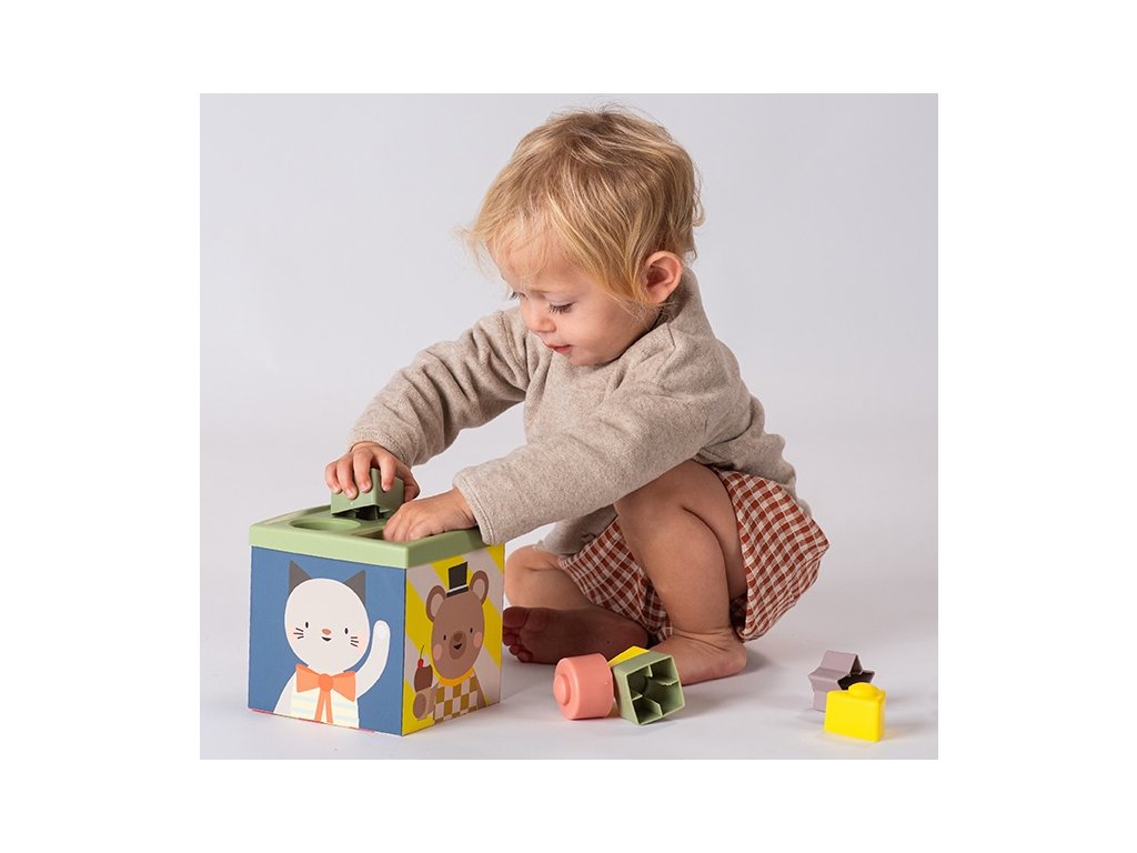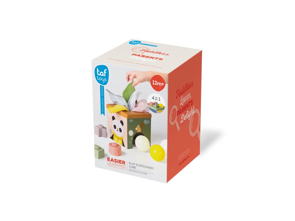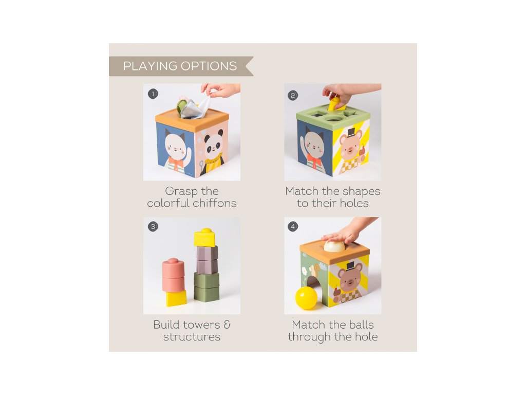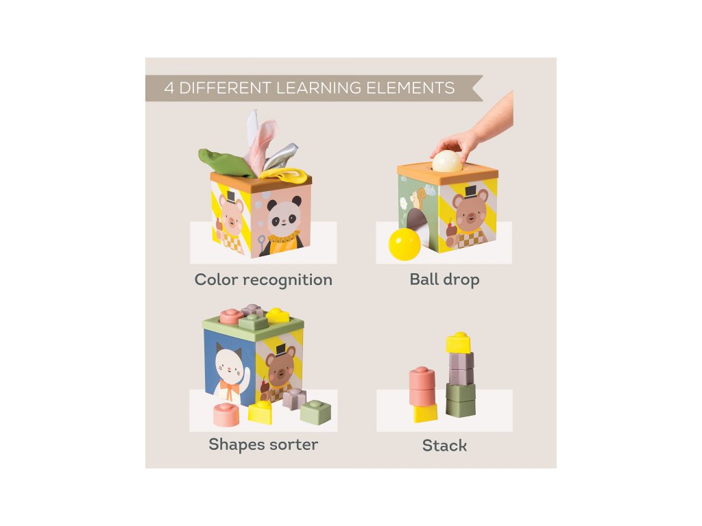Multifunkčný box s rôznorodými aktivitami je navrhnutý tak, aby podnecoval detskú zvedavosť, podporoval samostatné hranie a rozvíjal jemnú motoriku i kognitívne zručnosti dieťaťa. Vďaka farebným šatkám, senzorickým loptičkám a tvarom na skladanie si deti od 12 mesiacov užijú hodiny zmysluplnej zábavy.