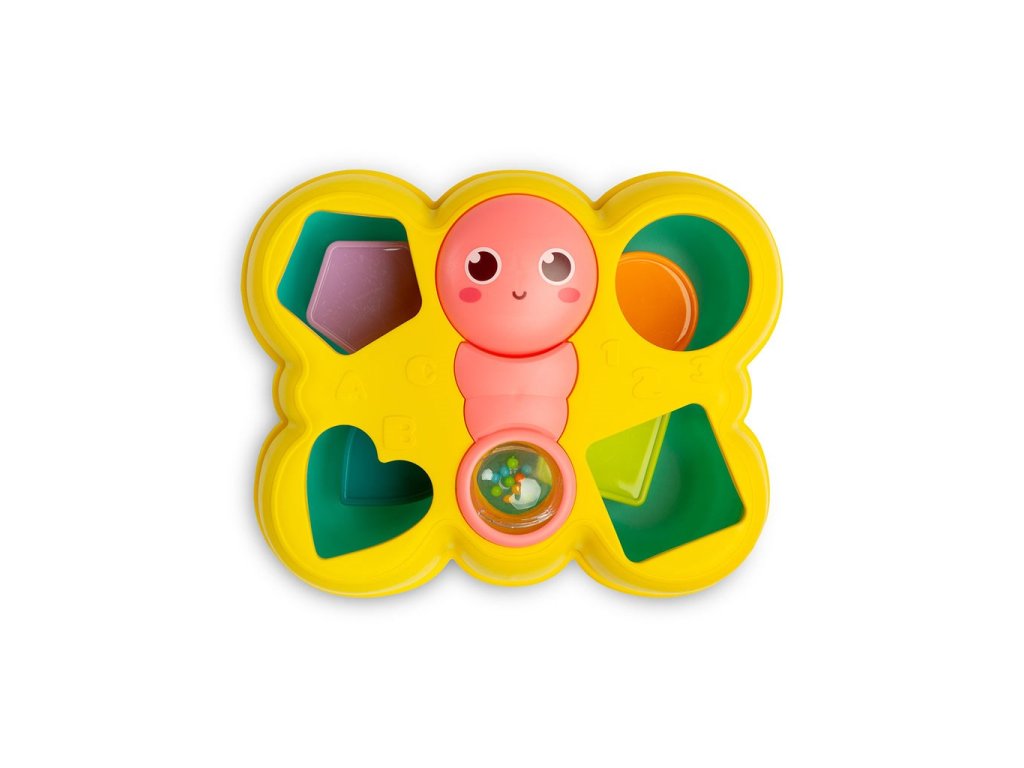 Motýlik je skvelá logická hračka pre najmenších. Obsahuje 4 farebné bloky, ktoré sa vkladajú do otvorov vo veku. Usmiatu tvár motýľa možno otáčať a chvost obsahuje priehľadnú guľôčku naplnenú farebnými hrkajúcimi guľôčkami. Hračka je vhodná pre deti od 18 mesiacov.