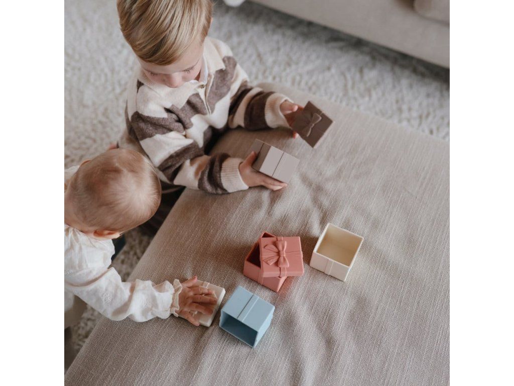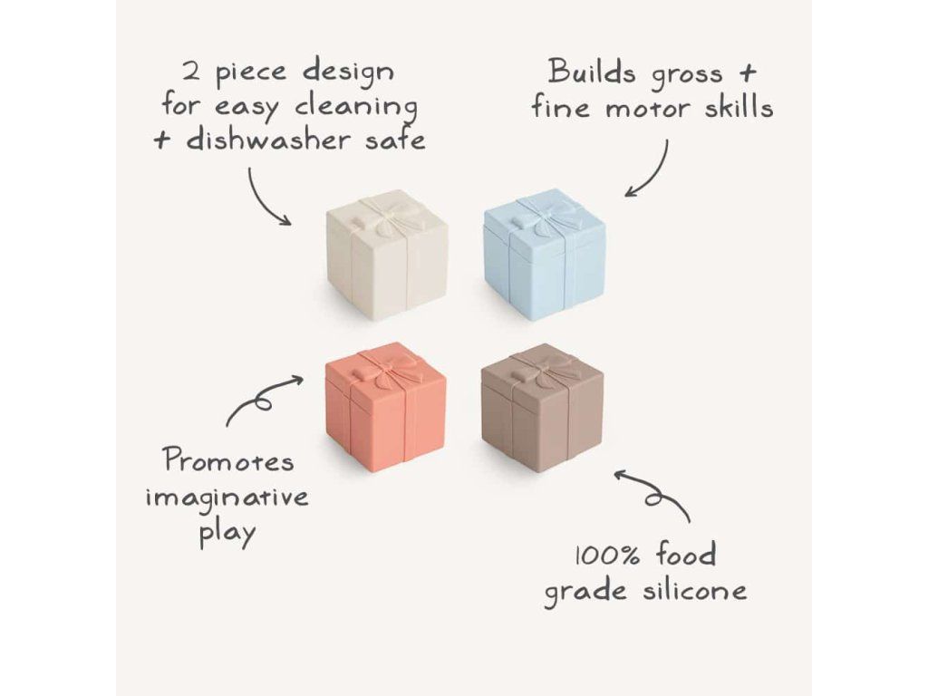 Vyrobené z mäkkého a bezpečného potravinárskeho silikónu, krabičky sú ideálne na stohovanie, kombinovanie a hranie bez obmedzení – doma, v škôlke či na cestách. Sada v jemných farbách zároveň pôsobí esteticky a vkusne v každom detskom kútiku.