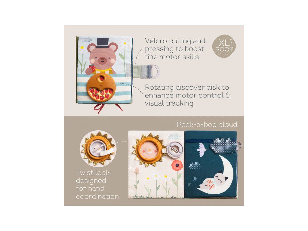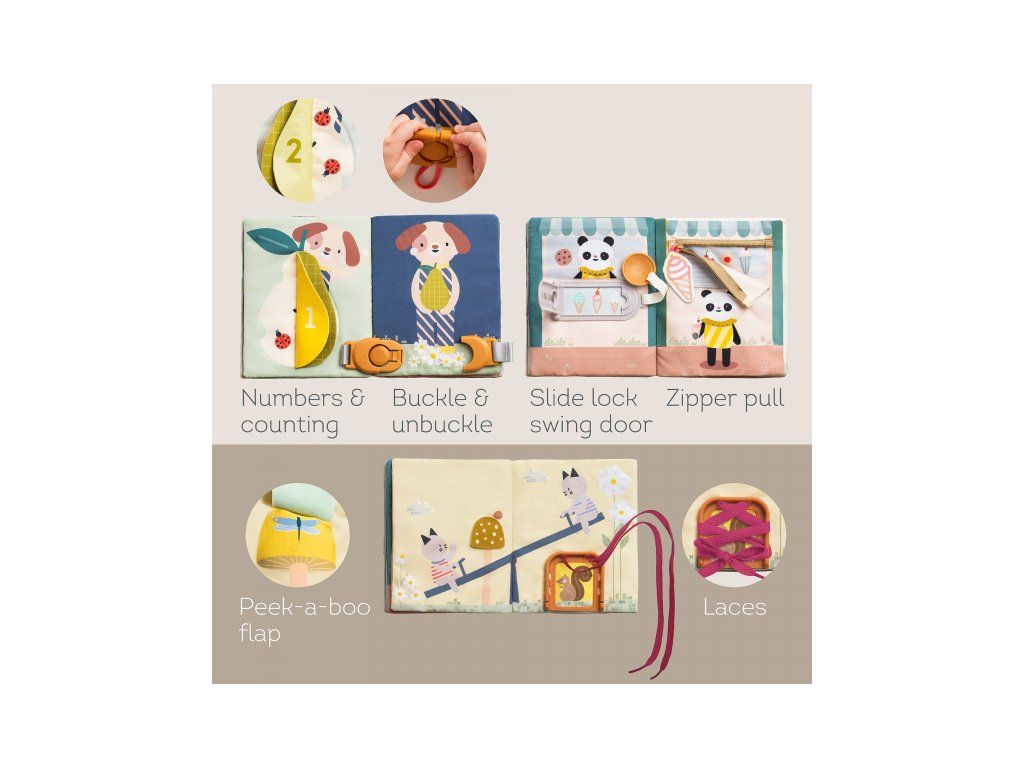 - 15 interaktívnych aktivít - zipsy, pracky, šnúrky alebo schovávačky - všetko, čo malé ručičky potrebujú na precvičenie zručností ako je zapínanie, viazanie a obliekanie
