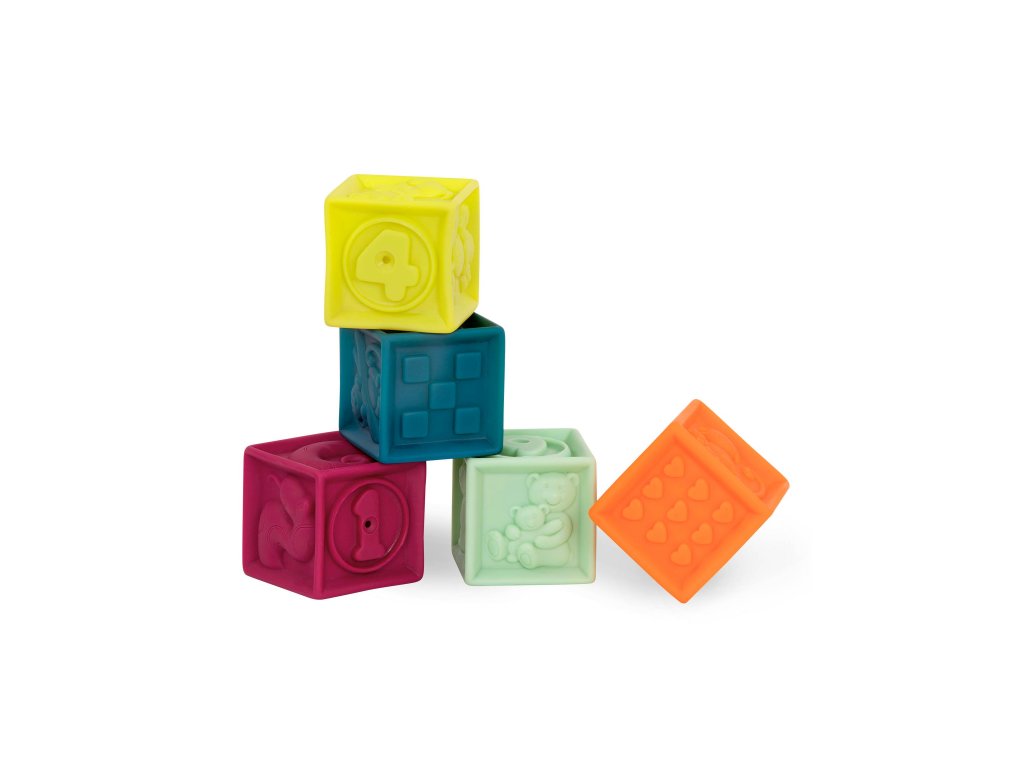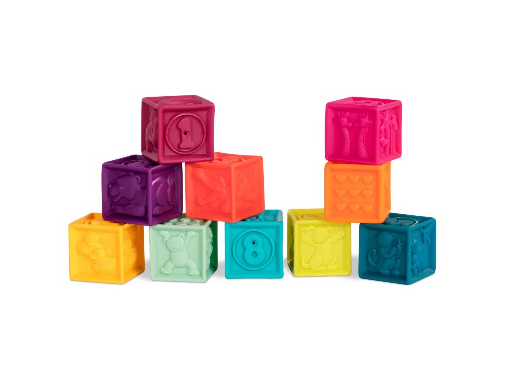 Kocky One Two Squeeze od Btoys vhodné pre deti od 6 mesiacov do 3 rokov. 10 rôznofarebných kociek s písmenami a zvieratami. Mäkký plastový materiál, po stlačení pískajú. Dieťa si s kockami môže hádzať, stavať z nich, učiť sa písmenká a názvy zvieratiek. V darčekovej taške na zips s držadlom do ruky pre ľahké upratovanie aj prenášanie. Taška textilného vzhľadu je vyrobená z recyklovaného polypropylénu. Taška môže byť používaná aj na iné hračky, maľovacie potreby a pod., Ideálna na cesty s dieťaťom. Ak sa tašky chcete zbaviť, jednoducho odstrihnite zips a vinylovú prednú stranu, PP "textília" je nielen recyklovateľná, ale aj biologicky odbúrateľný.