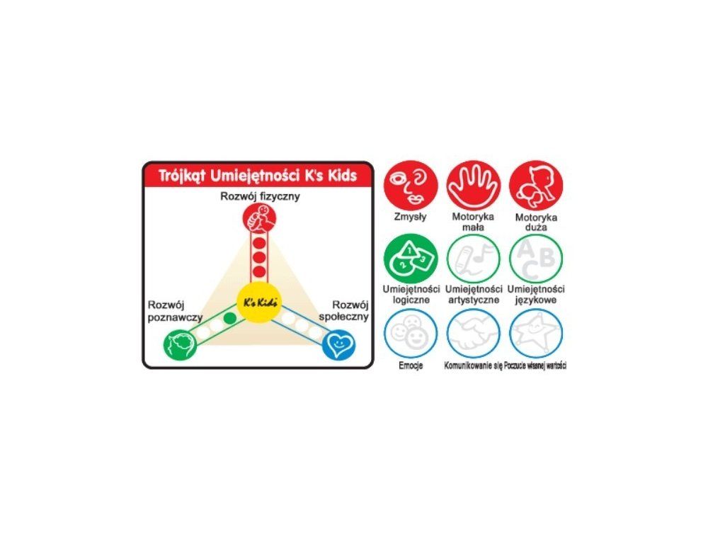 Trojuholník zručností, ktorý je súčasťou balenia každej hračky Ks Kids, poskytuje rodičom prehľad o tom, ako hračka prispieva k rozvoju dieťaťa v rôznych oblastiach.