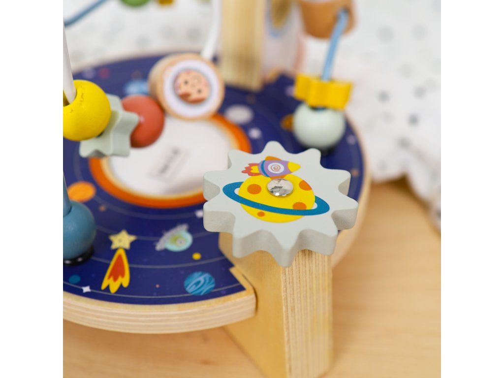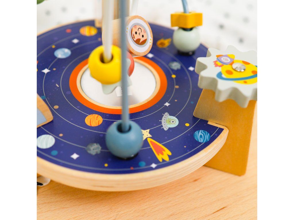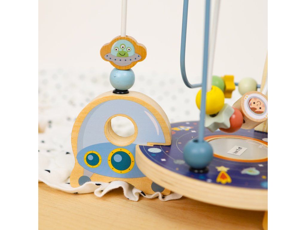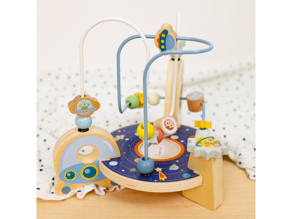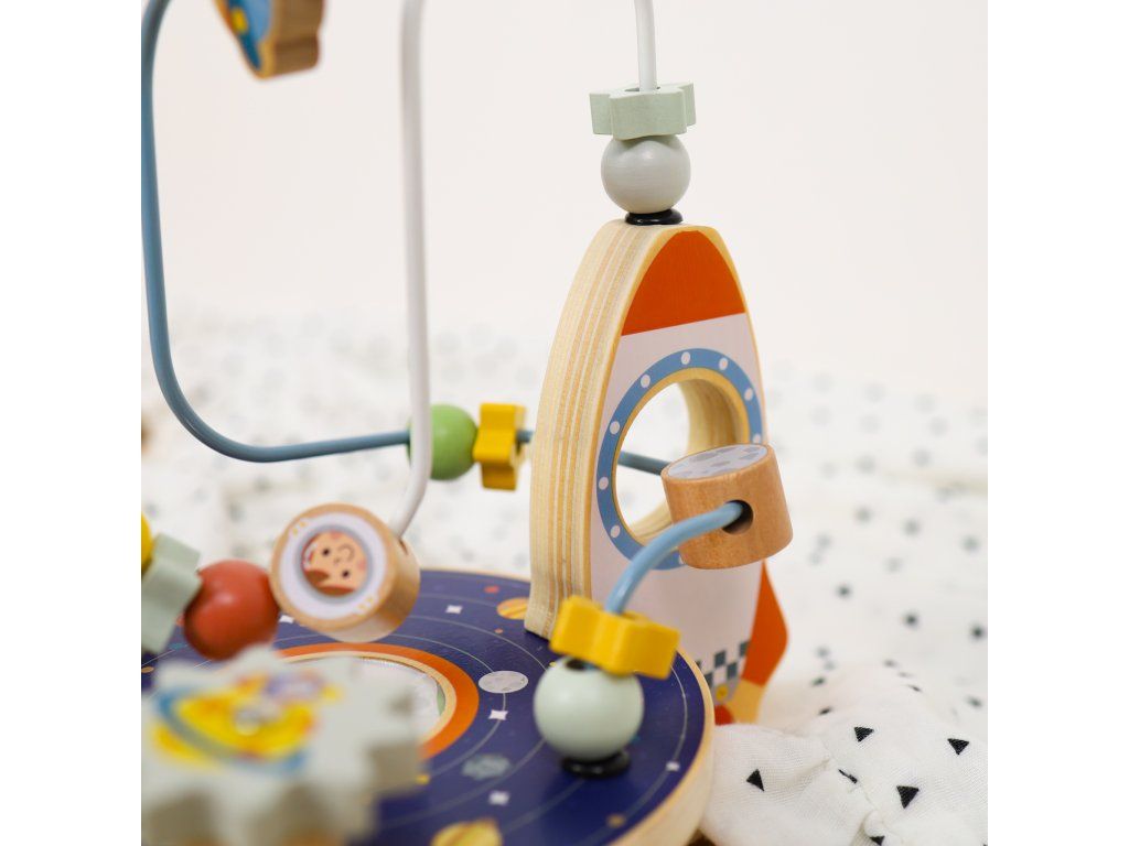 Labyrint Vesmírna raketa Originálne bludisko pre najmenších Drevený motorický labyrint s motívmi vesmíru od Tooky Toy v nadčasových pastelových farbách ponúka množstvo zábavy pre deti už od 1 roka. Deti posúvajú hviezdy a iné časti vesmíru v podobe drevených korálikov cez vesmír až k rakete. Väčšie deti využijú túto drevenú hračku aj ako kulisu pre svoje hry. Bludisko je kompaktné, takže ho ľahko postavíte na akýkoľvek rovný povrch.Skvelé na rozvoj jemnej motoriky Nádherný motorický labyrint taktiež rozvíja koordináciu ruka-oko, vnímanie farieb, schopnosť sústredenia, fantáziu či predstavivosť. Drevené hračky pre deti od Tooky Toy sú vyrobené z kvalitných materiálov a pre deti úplne bezpečné. Drevené prvky sú z pevného, dobre opracovaného dreva natretého netoxickými farbami a lakom.Dodatočné parametre